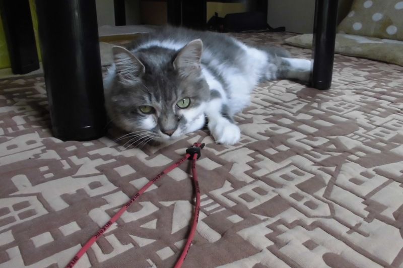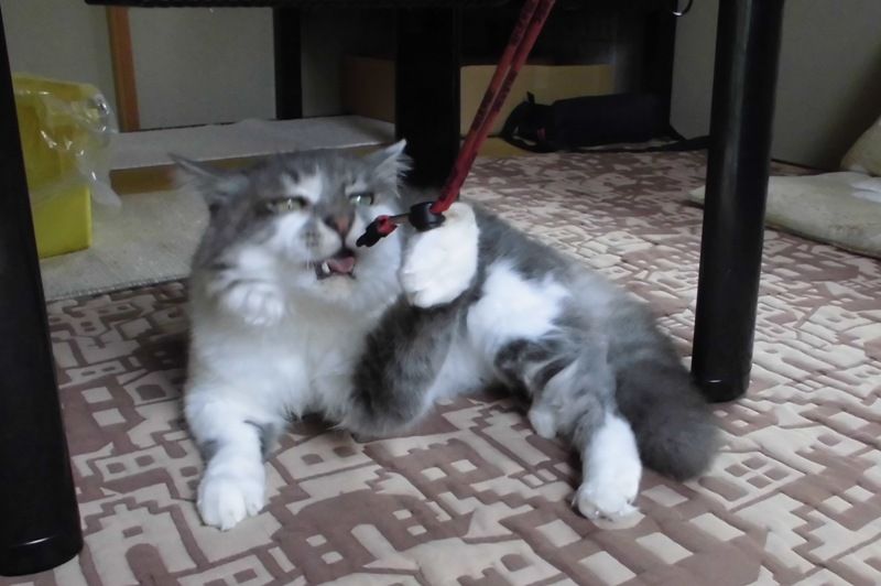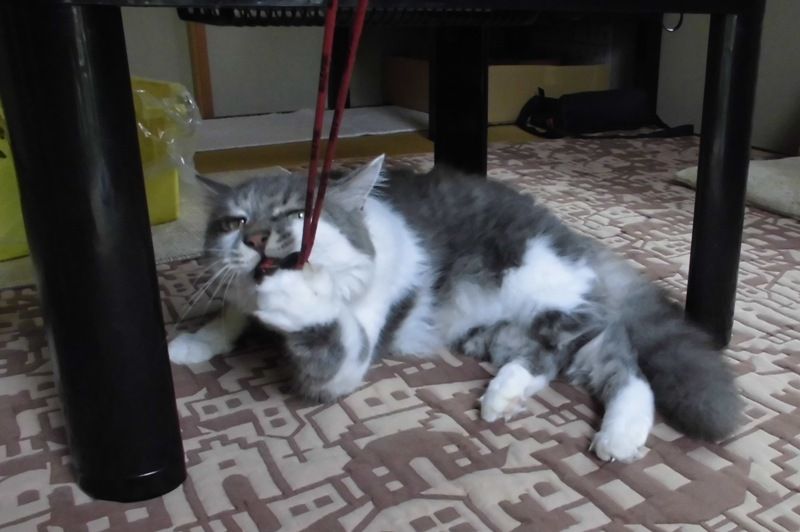 紐をテーブルの足に絡めて自分で動かして遊んでいた