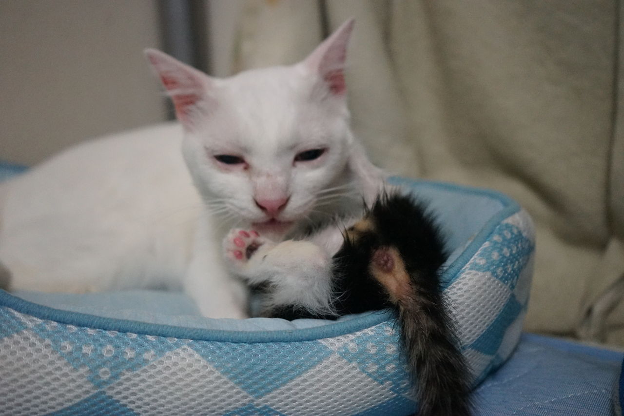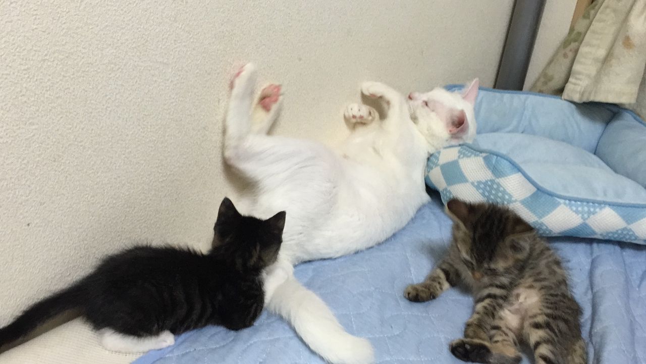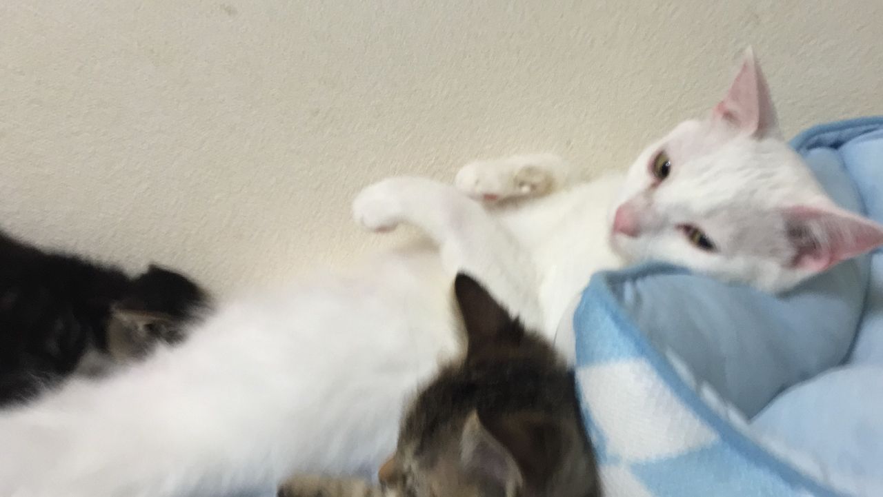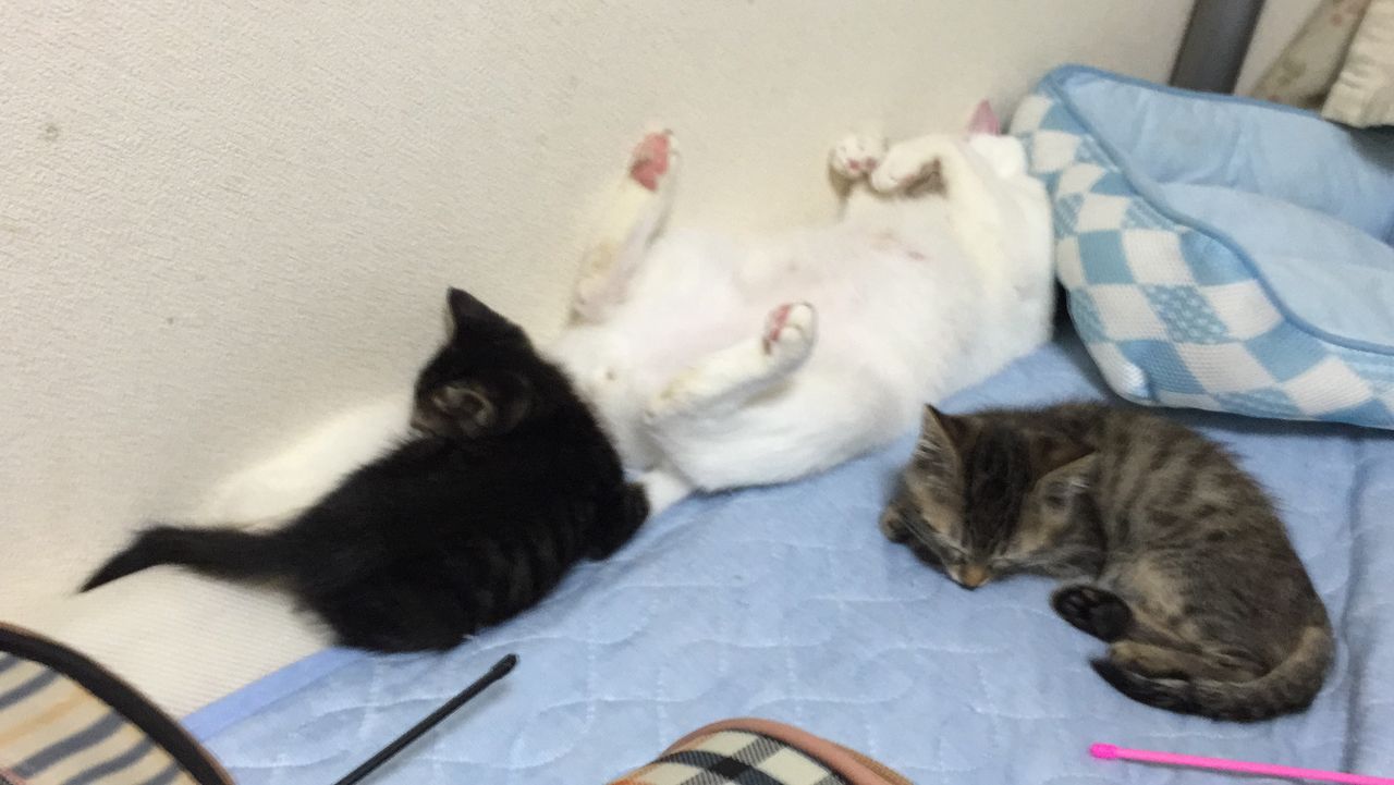 麿白、4匹の子猫の育児に今日も励んでいる。