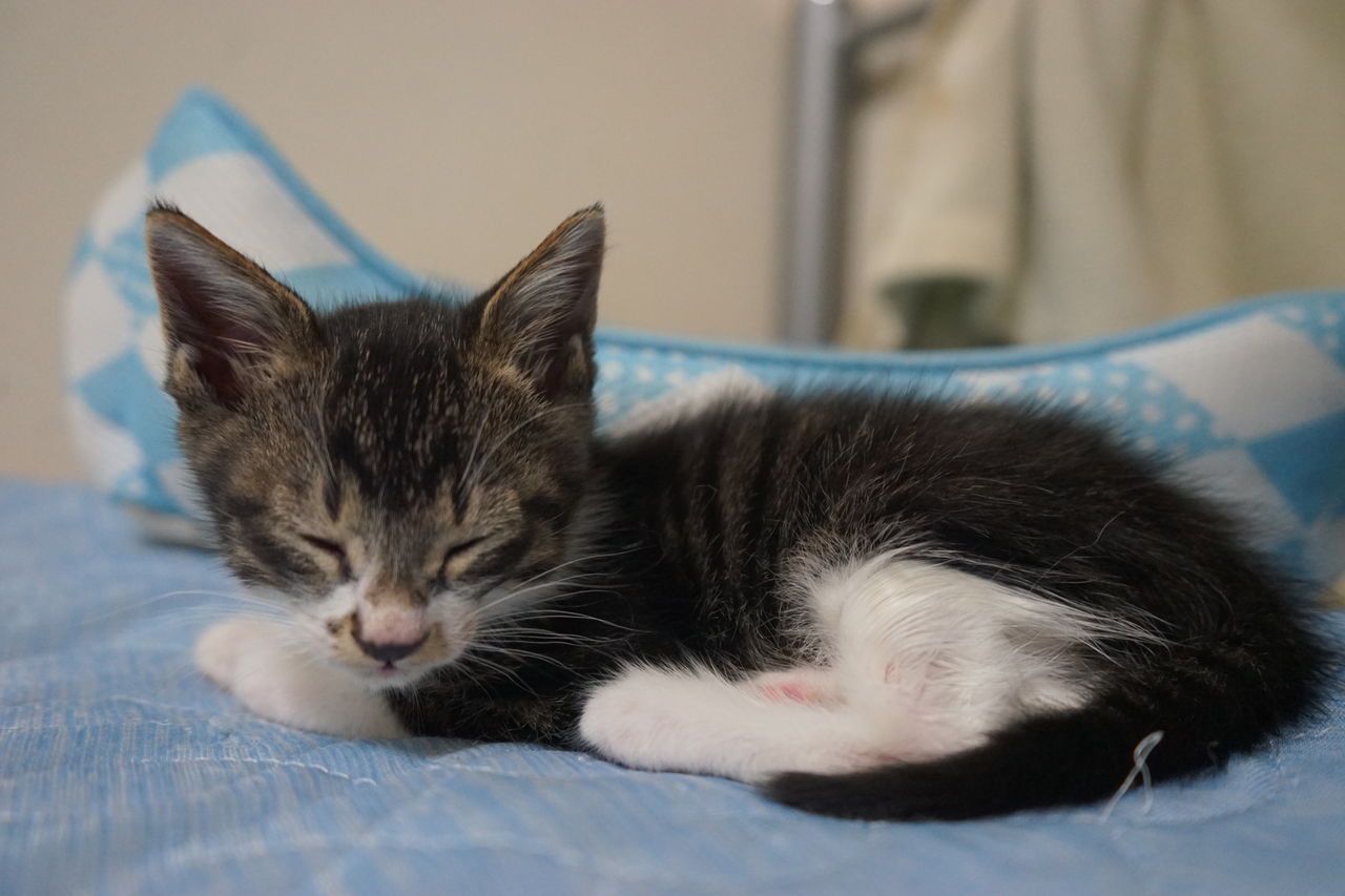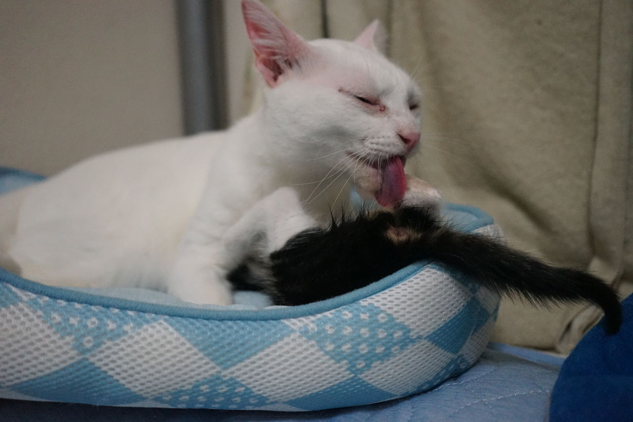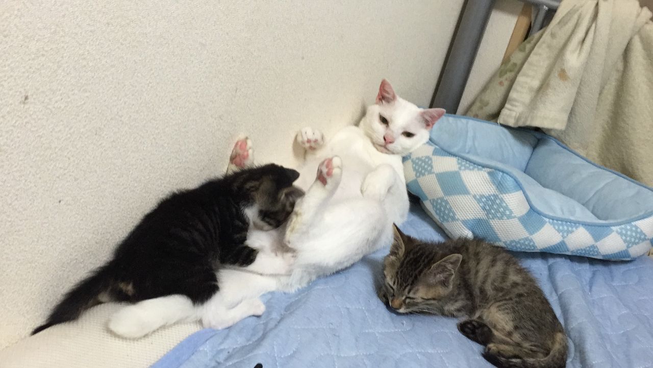 麿白、4匹の子猫の育児に今日も励んでいる。