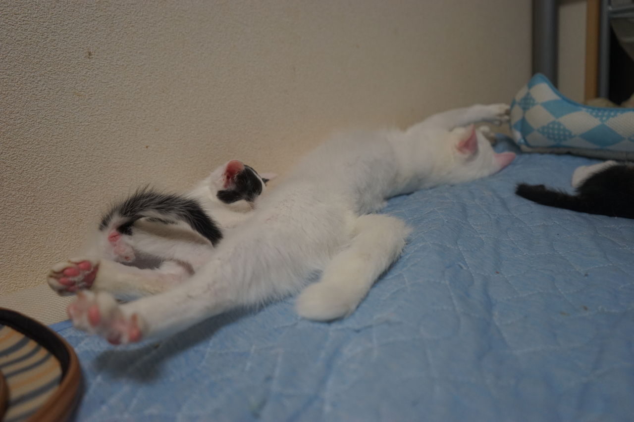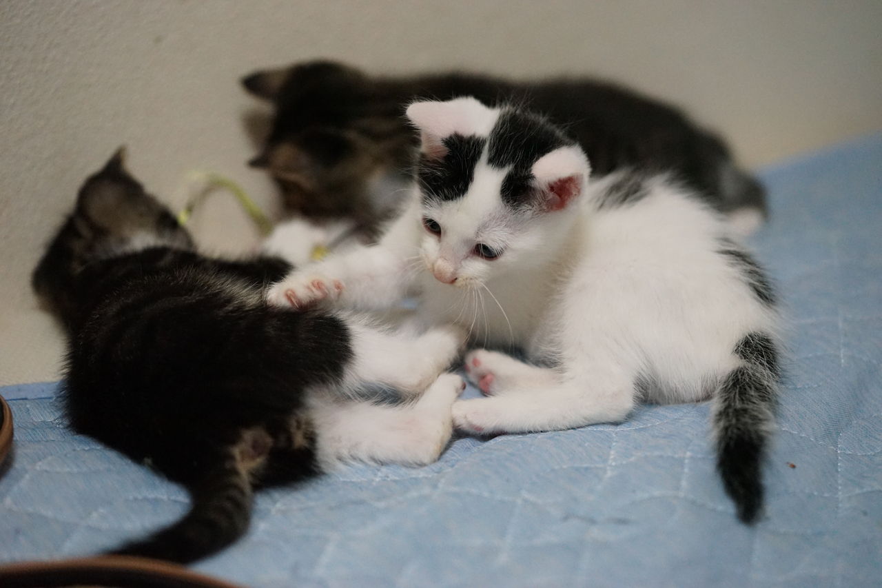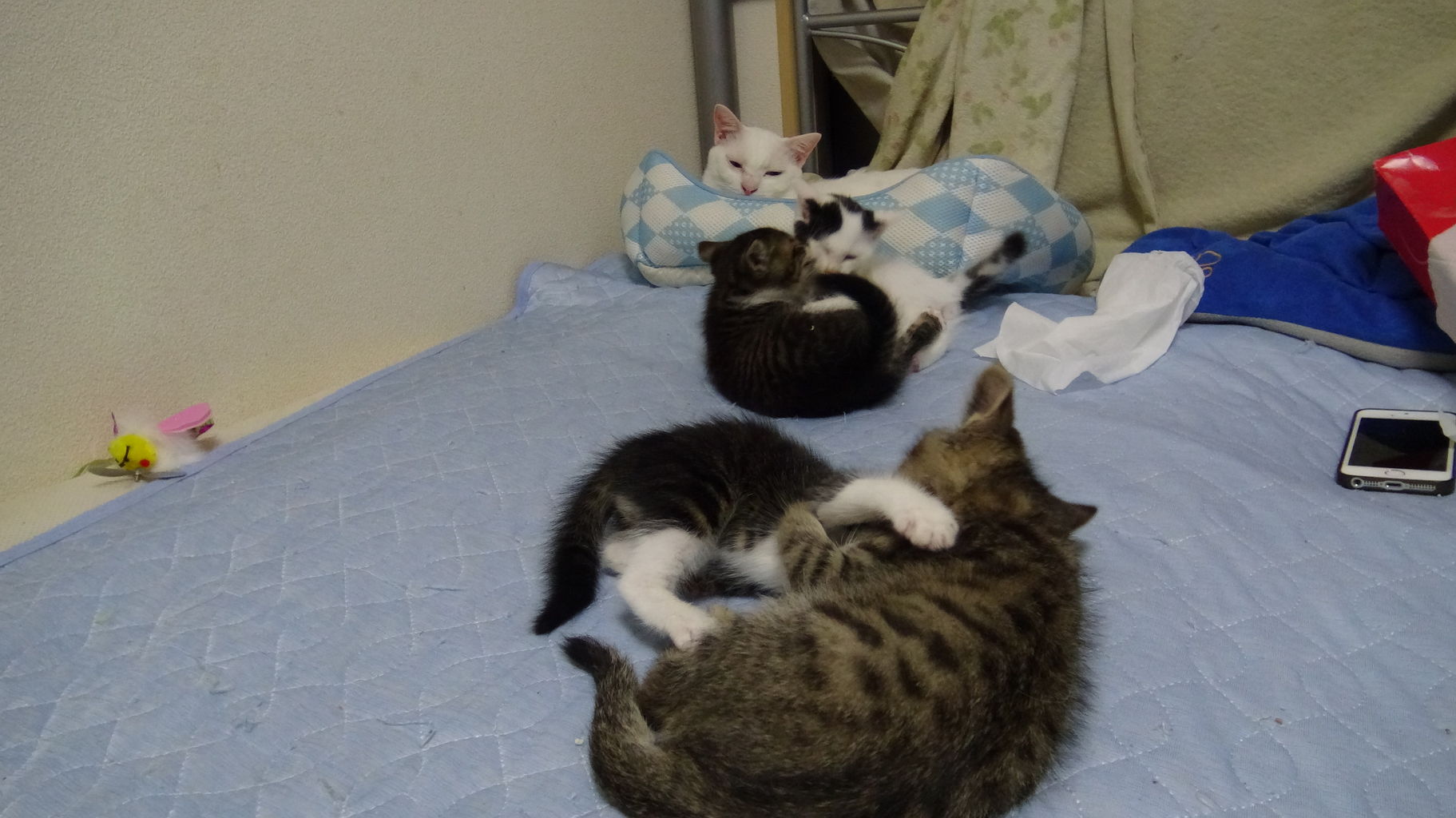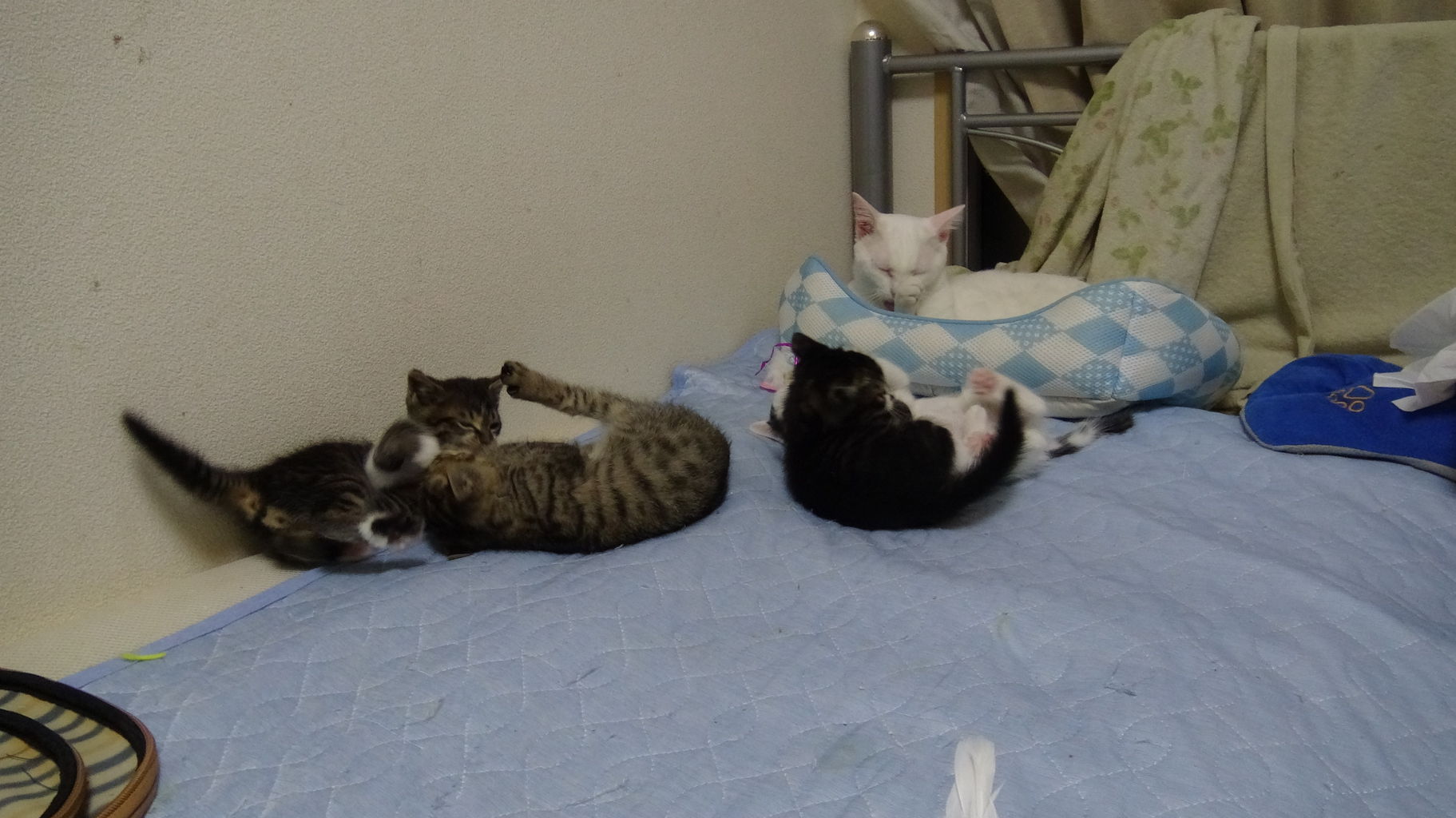 ベッドや部屋を所狭しと転がり回る子猫たち。