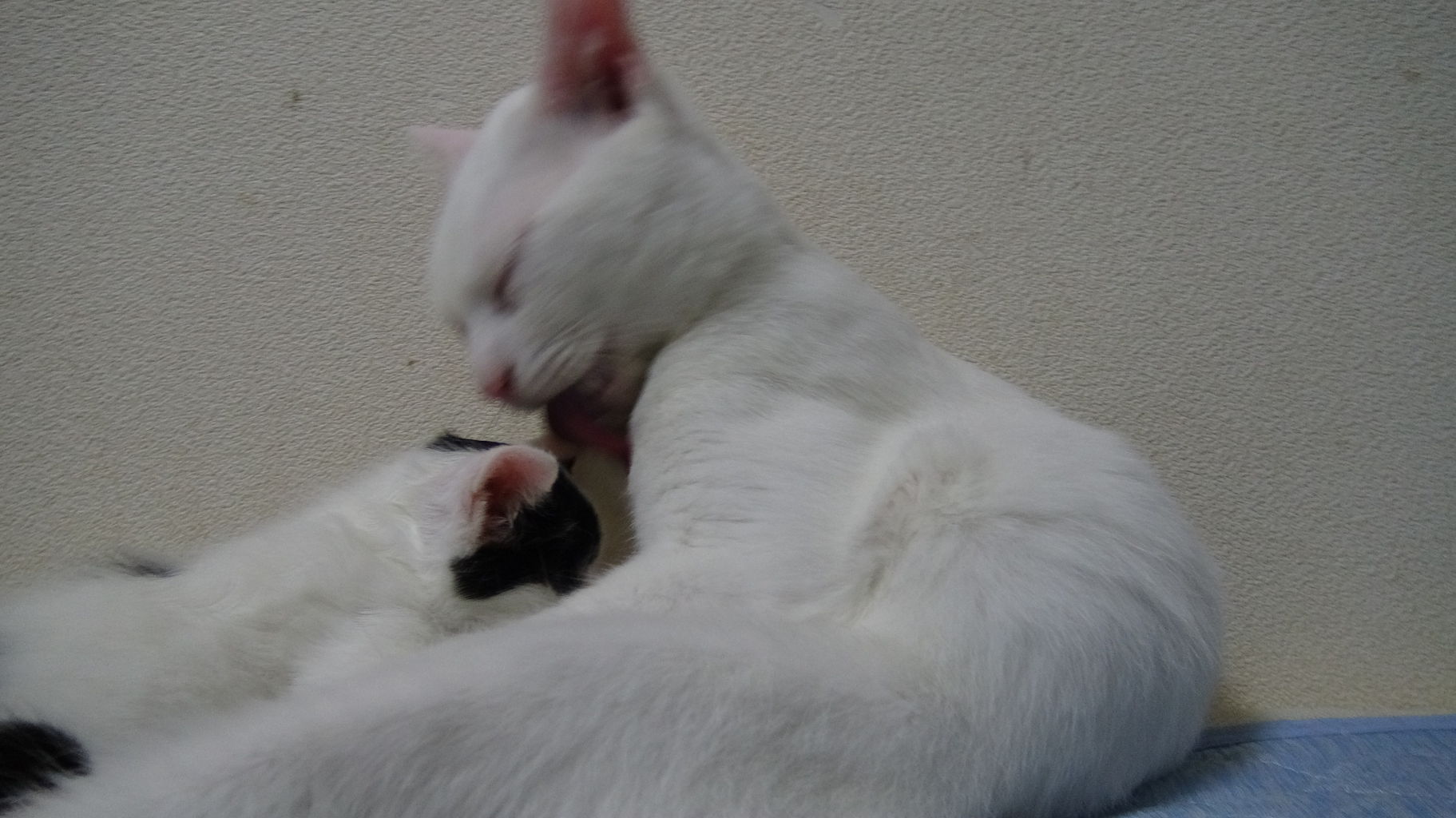 ようやくグルーミングも上達してきたが、今度は配分が解らないらしく、子猫たちはいつも麿白の唾液でびしょ濡れである。それでも上達はしているのである。