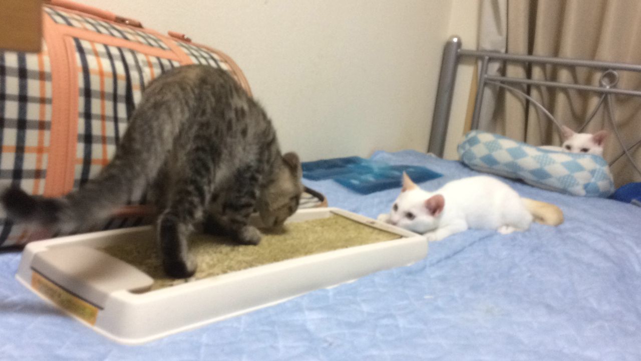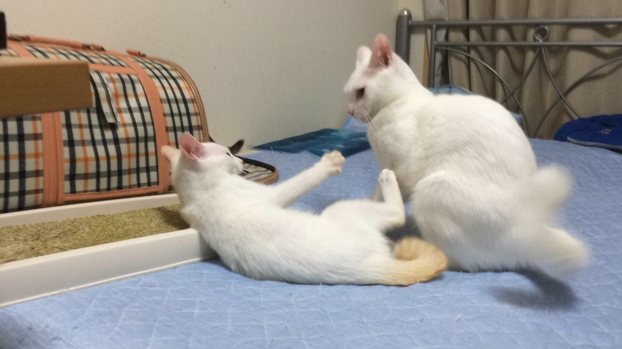 体格差のある麿白より、子猫同士の拮抗したやり取りの方が本猫たちにとっても楽しいのかもしれない。