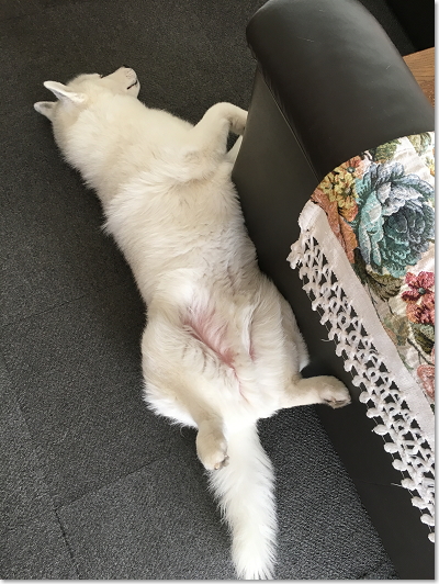 ソファの裏側にカラダを沿わせて寝るのが落ち着くんだぜ~。