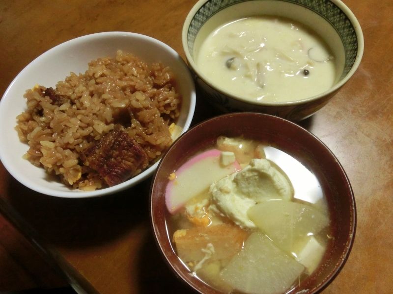 夕食は、残り物ですが、うなぎせいろ+お昼のクリームシチュー+母のために作った大根の味噌汁です。