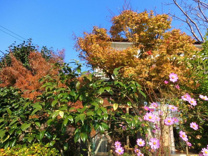 最近の冷え込みで、我家の庭木もやっと色づいてきたけど、綺麗な紅葉にはならず、落葉になりかけてますよ。