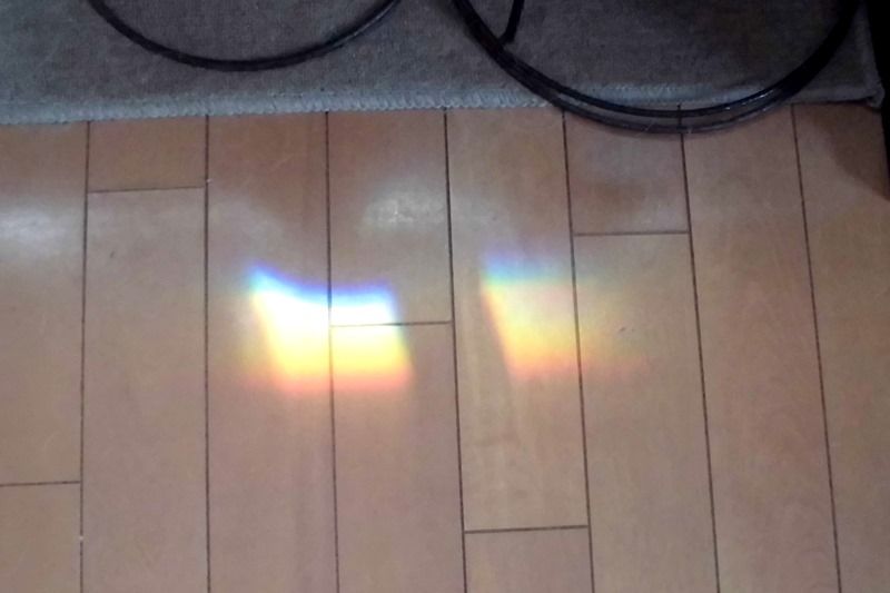 二つ並んだ水槽が窓から射す朝日を受けて床に虹を映します