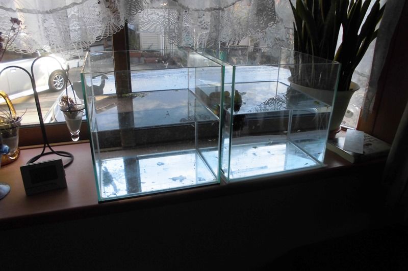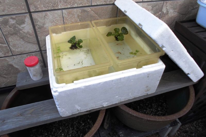 親メダカたちは、防寒の発泡スチロールの中に