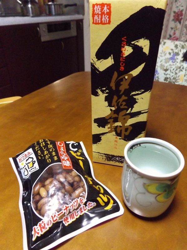今夜は、黒伊佐錦とゆでピーナッツ。