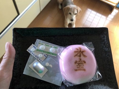 朝のおっくんタイムは氷室饅頭の皮におっくんを包んで与えました。