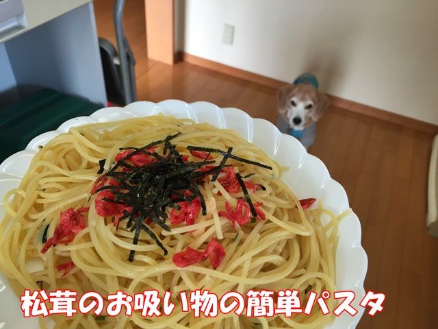 茹でたパスタをバターと松茸のお吸い物で和えて干し海老と切り海苔をのせました。