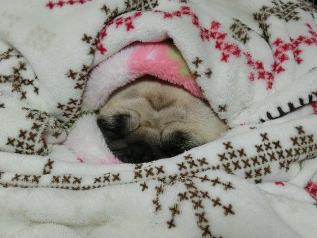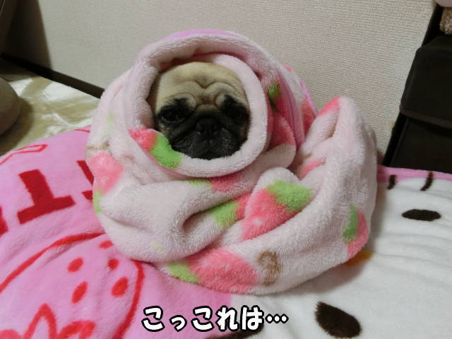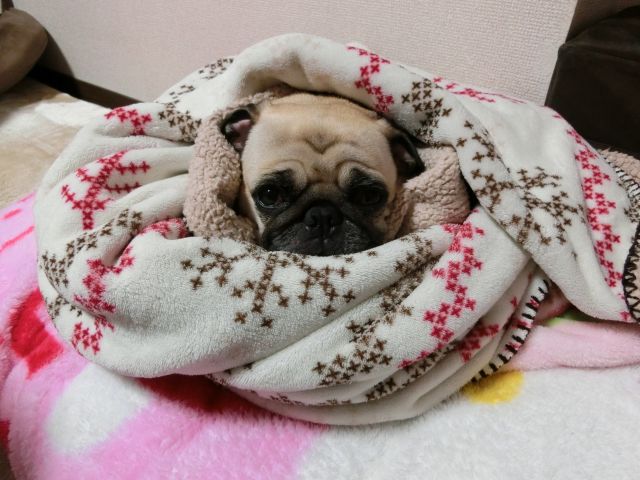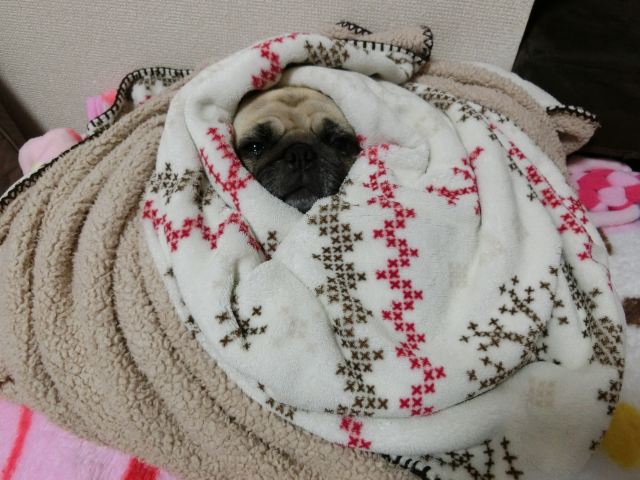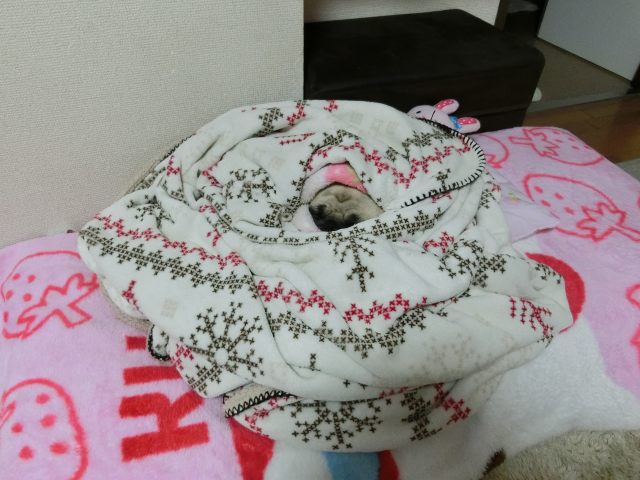 お家の中では、まだまだ毛布にくるまっているはなちゃんです。