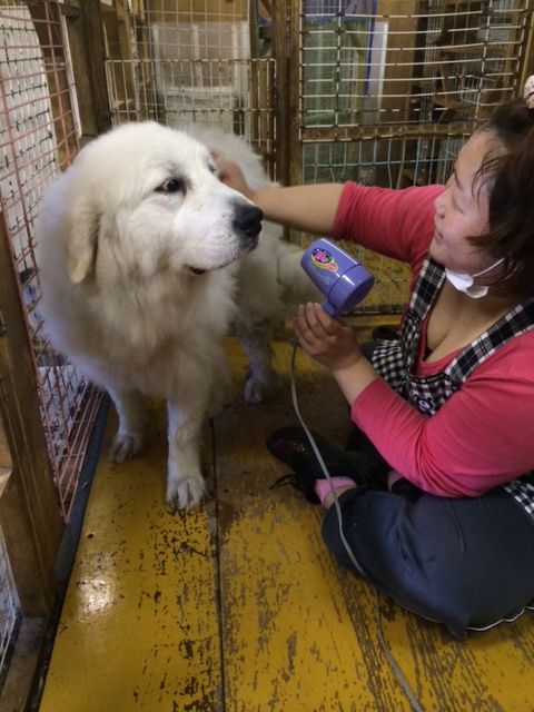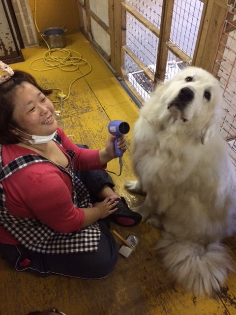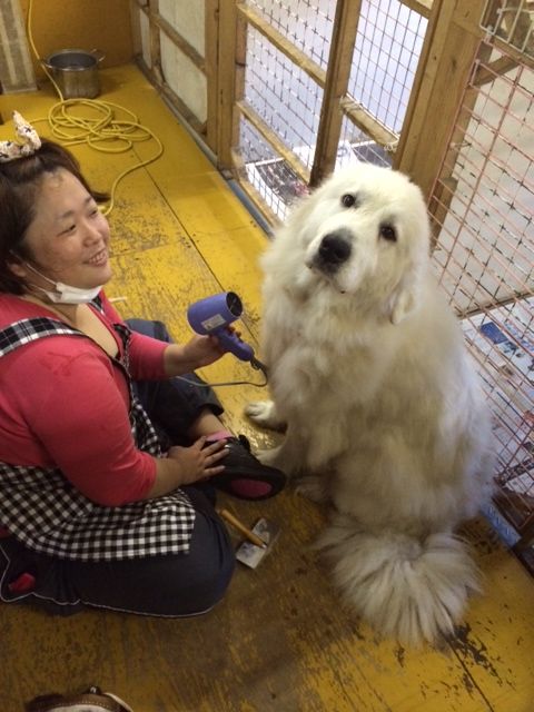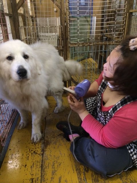 今日のお見合いに向けて お散歩隊のスタッフさんが ハイジのシャンプーをしてくれました (⌒‐⌒)
