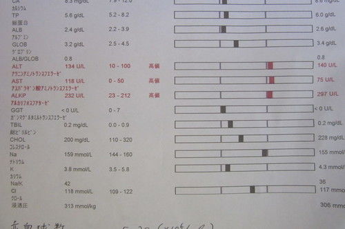 ALT:140 (6/25)→134(6/27) 基準値は、10-100
