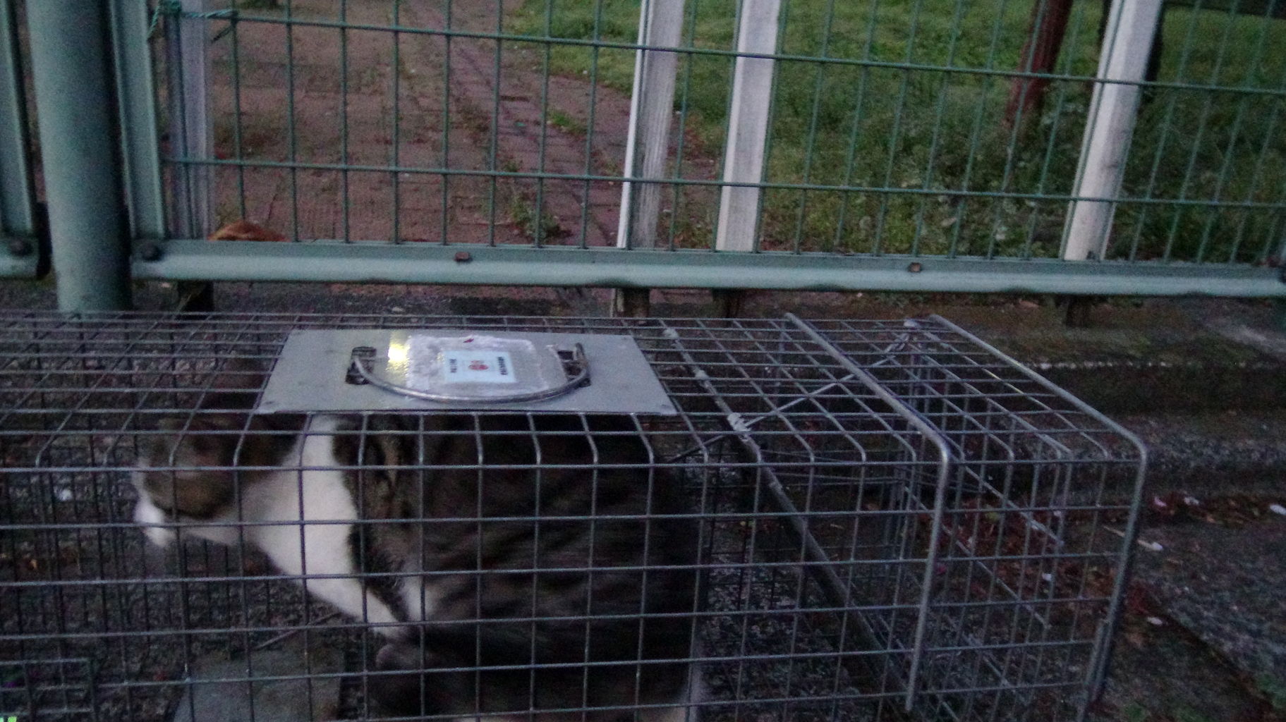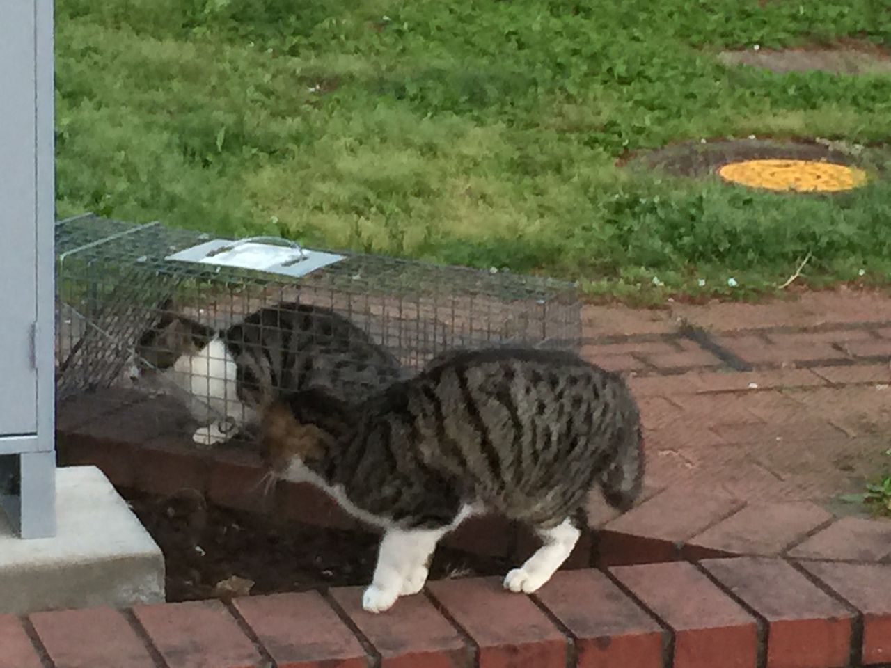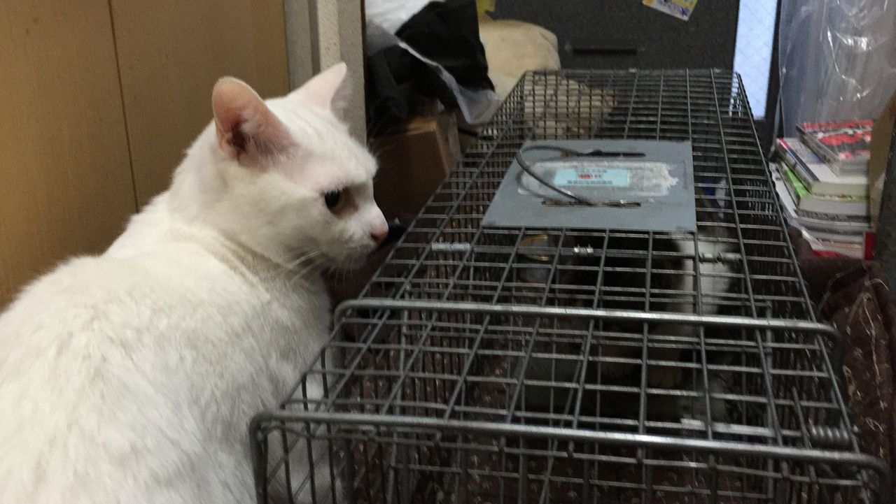 捕獲機の中におもちゃを吊るして誘導し、最終的にはそれで捕獲機の踏み板を踏んだ。