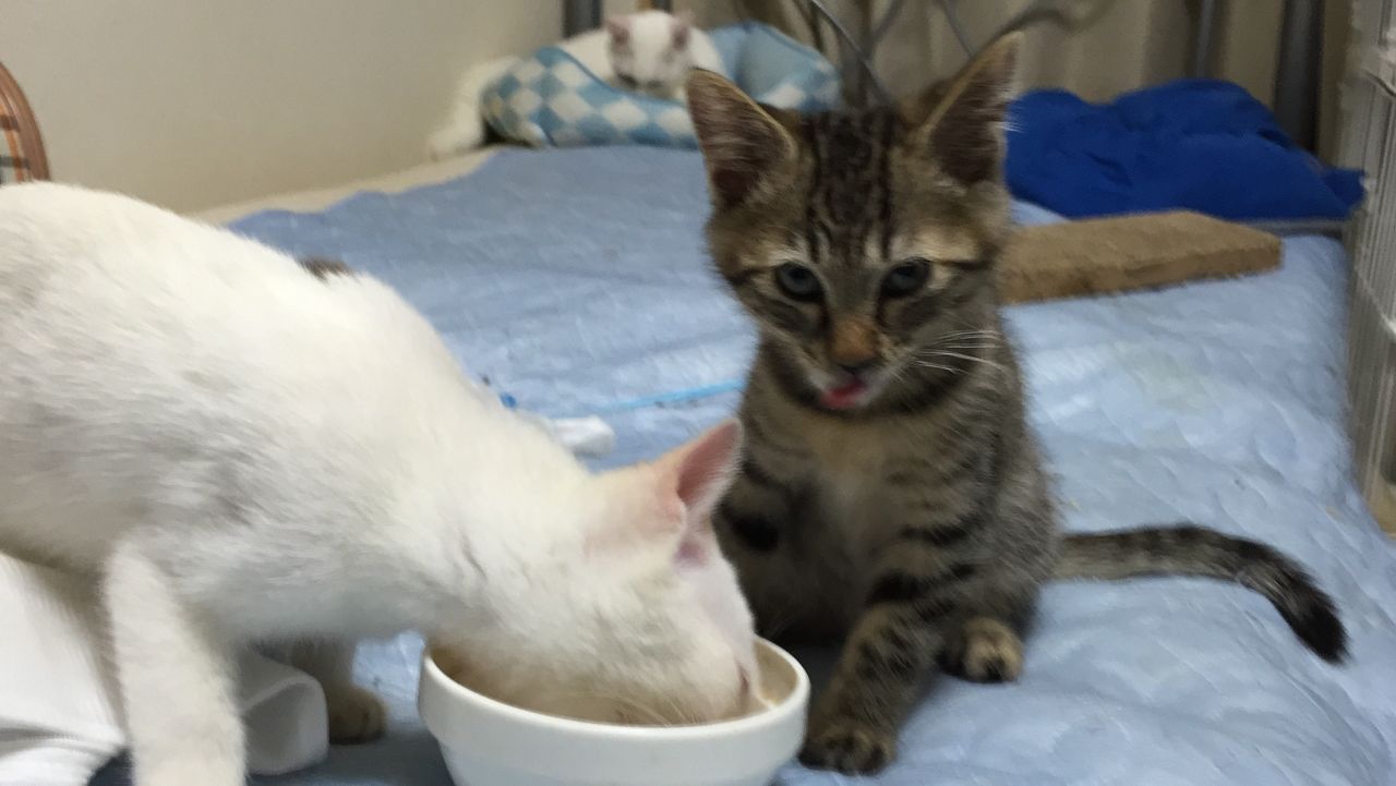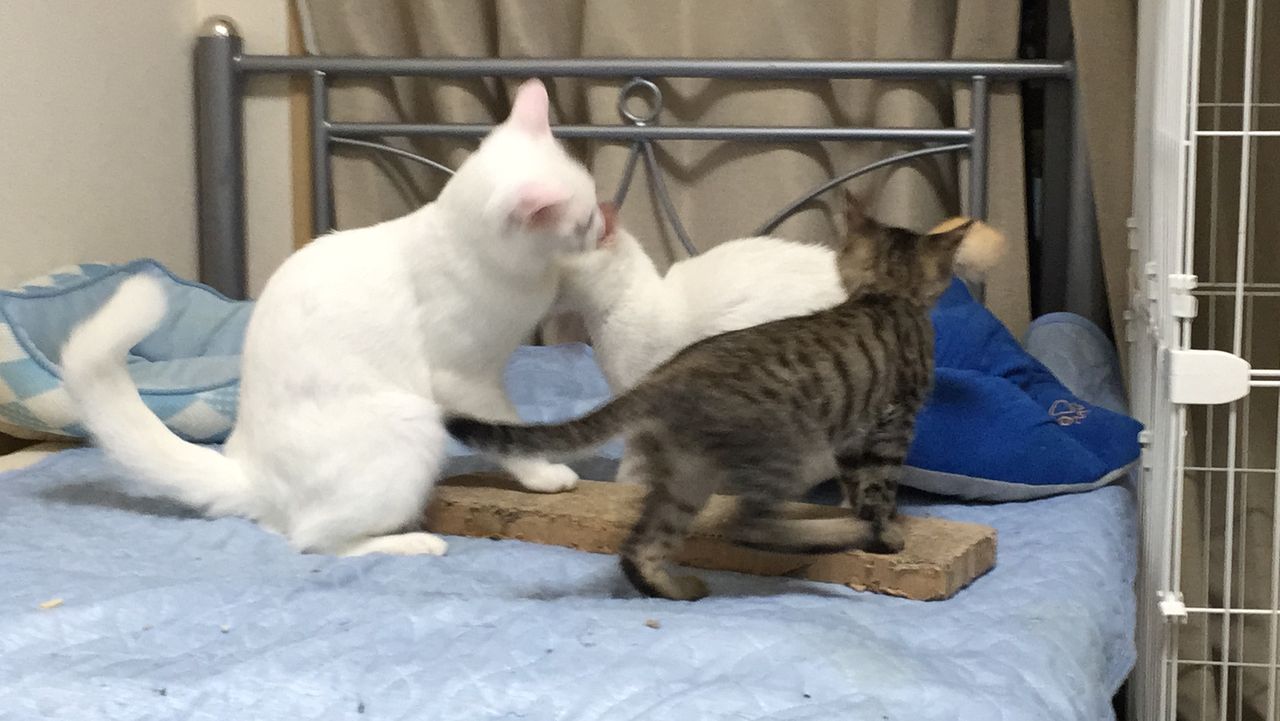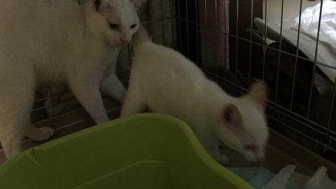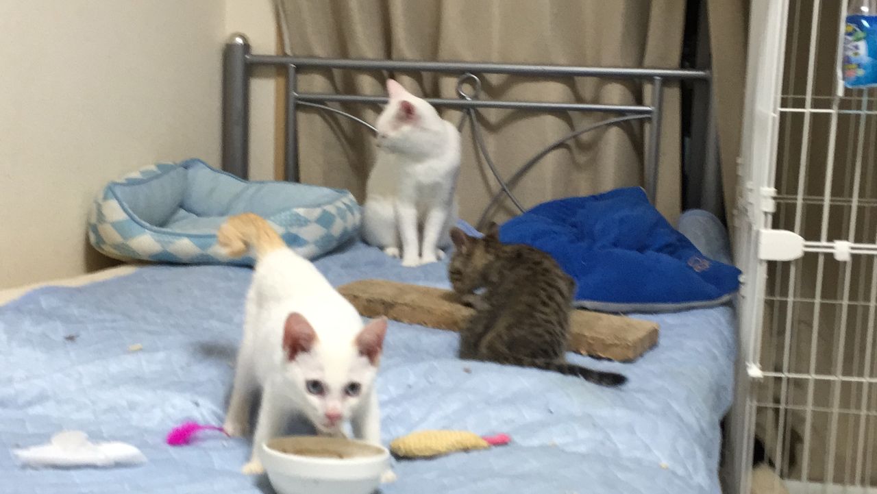 いざ、琥白を部屋に入れてみると、子猫たちは麿白と勘違いしたのか右往左往する。