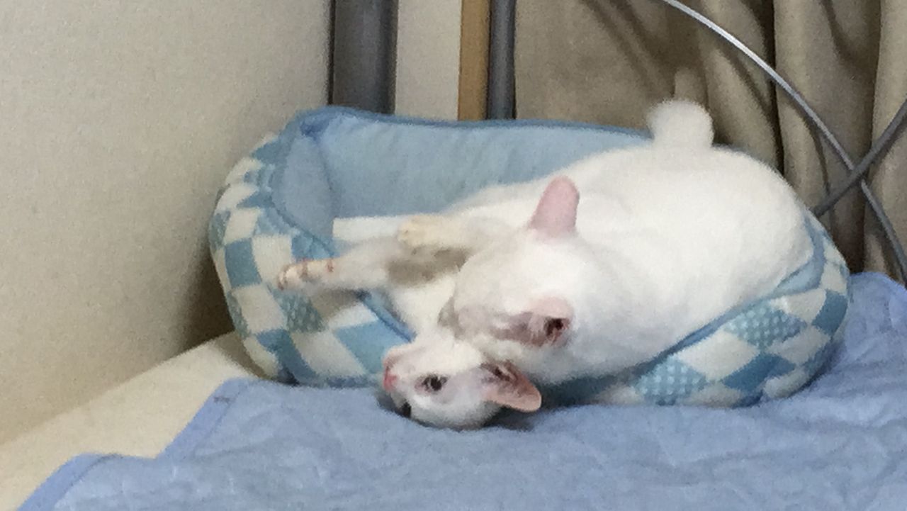 麿白、猫ベッドに寝そべる琥白に猫的教育的指導である。
