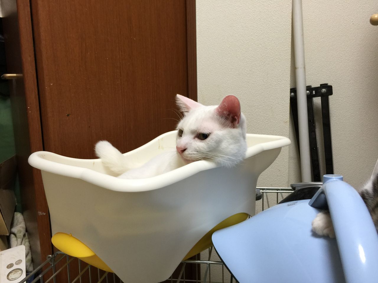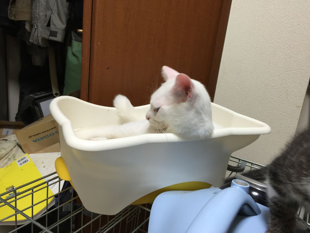 フードなどを購入して帰宅すると麿白がシステムトイレでくつろいでいた。