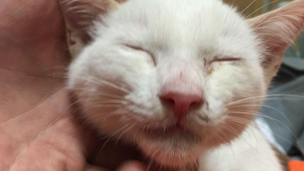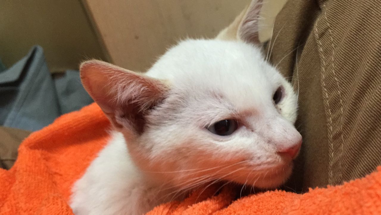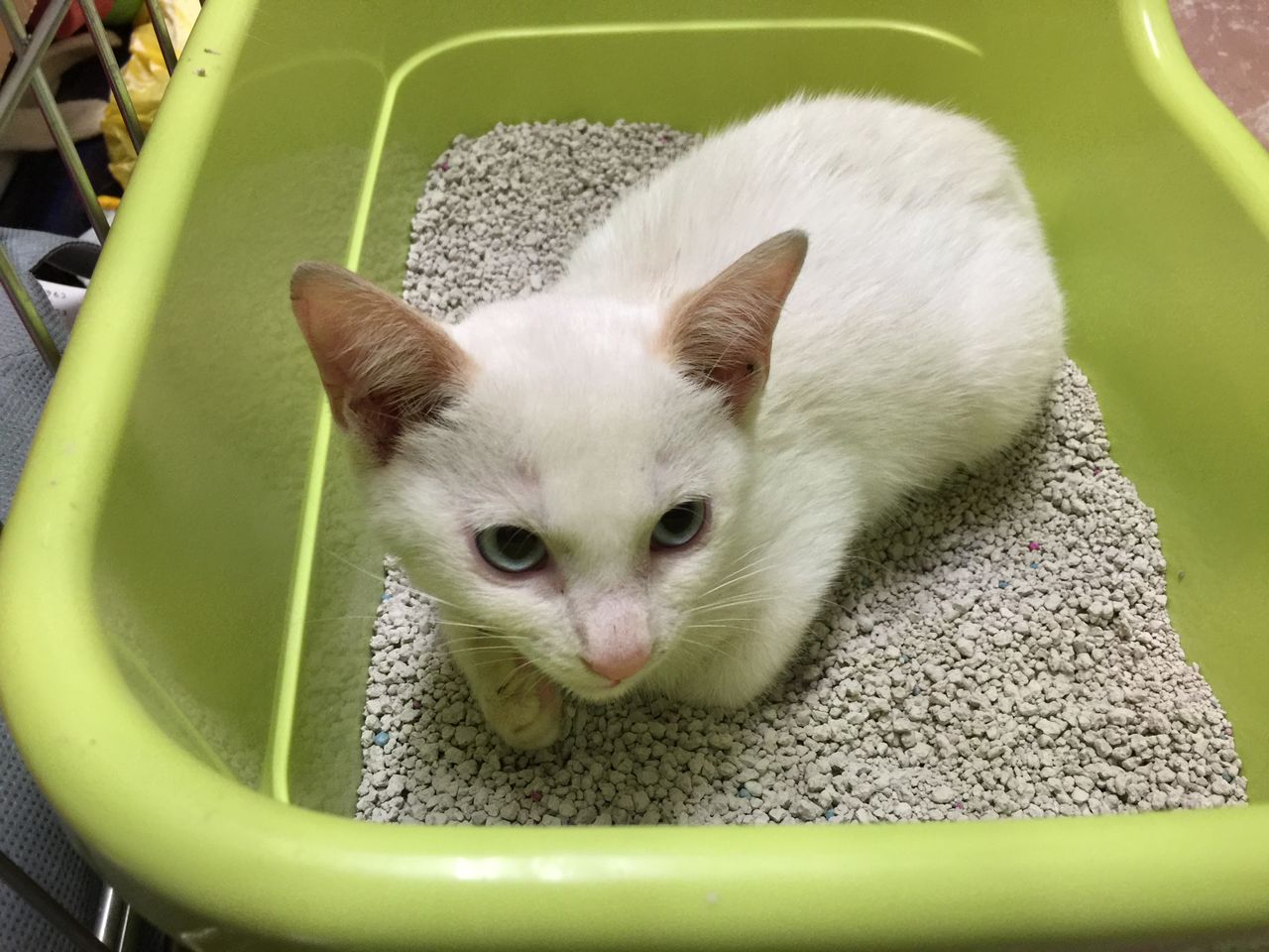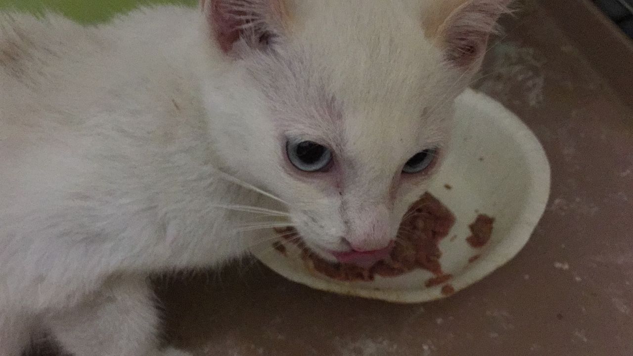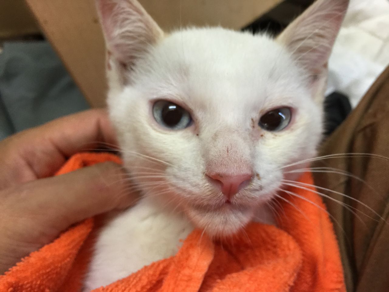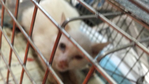 いざ、捕獲機を開けて白い子猫に向かい合う。