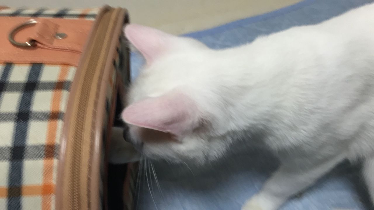 キャリーに入れると前の二匹同様に抵抗を見せる麿白。