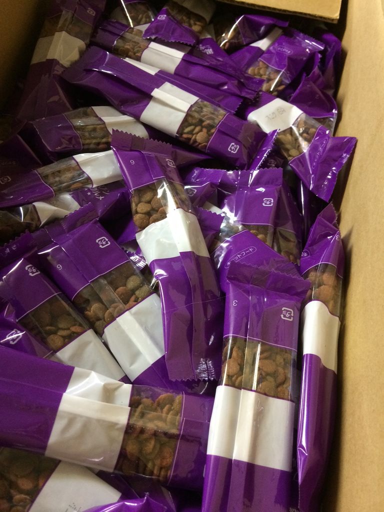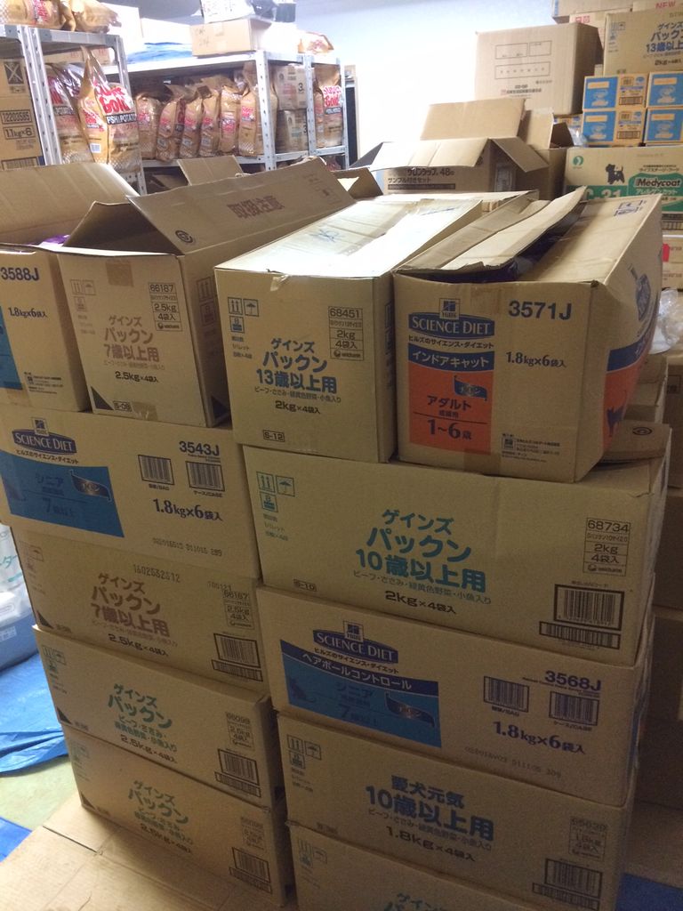 箱が潰れて 売れないフードを沢山戴きました ダンボールに 400キロくらいあり 地域猫の方も大喜びです、 野良ちゃんも とても過酷な中で生きています、少しでもお腹いっぱい食べられたらと思います。 私達は福島の犬猫達の保護や 野良猫ちゃん達の保護まで 手は回りません せめて フード支援を通して 協力して行きたいと思います。 ペット里親会