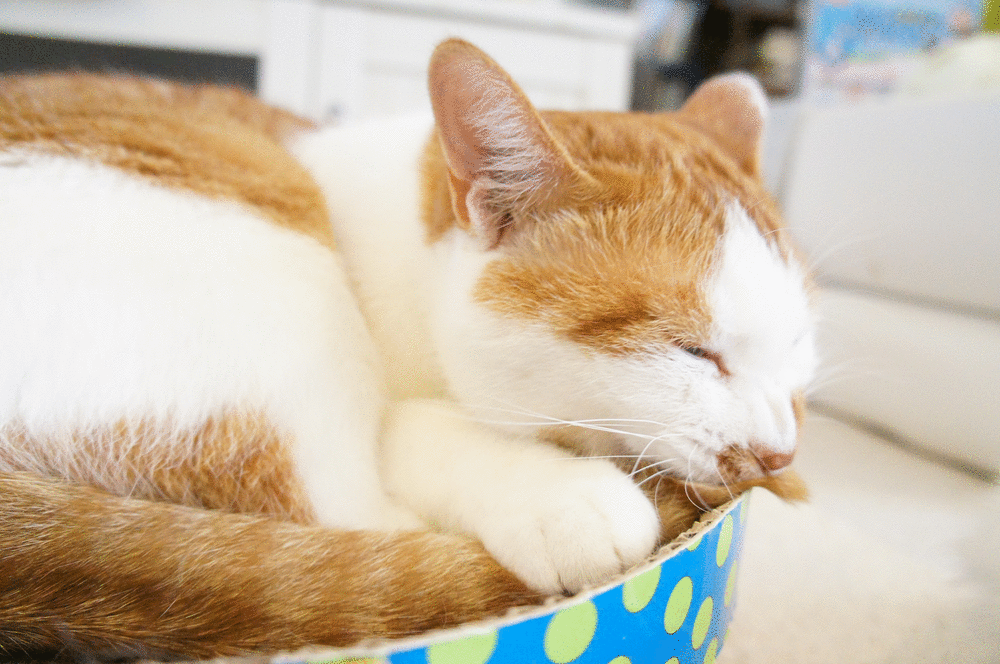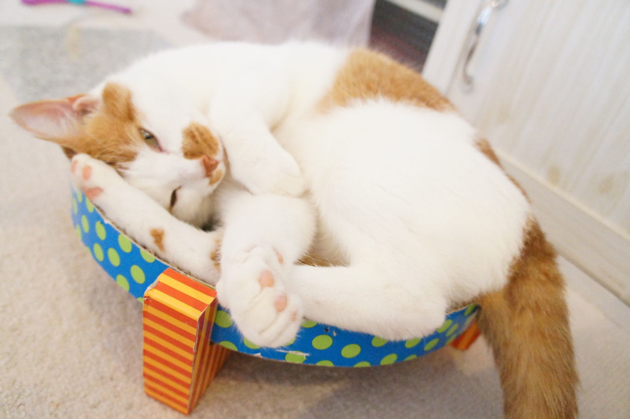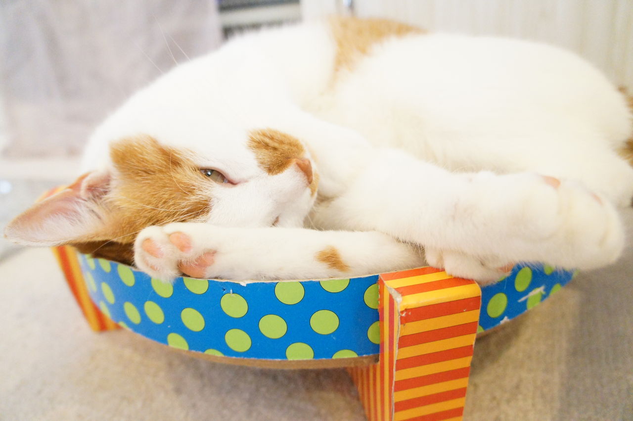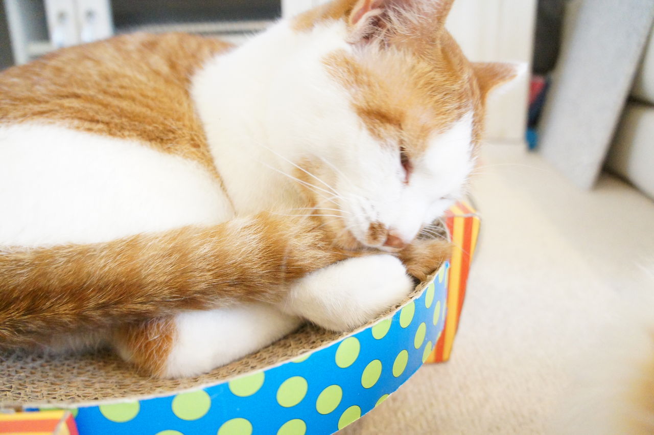 くつろぐのは、もっぱら このお気に入りの段ボール製ベッドの上。