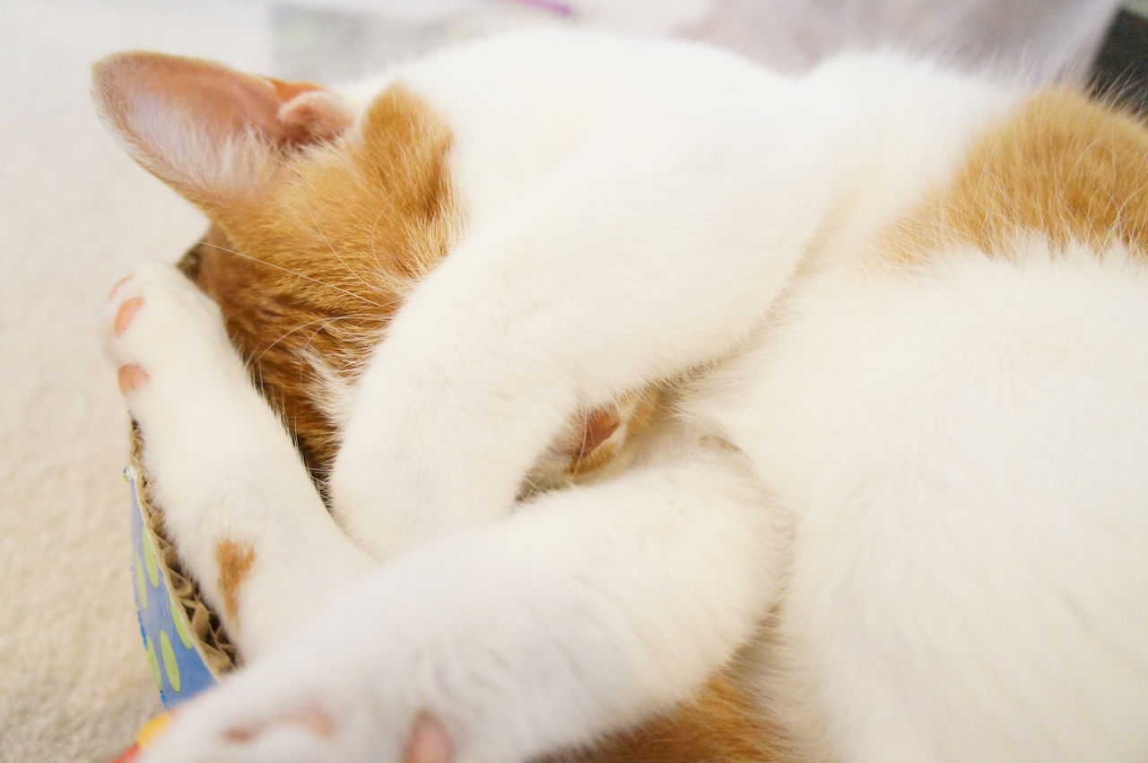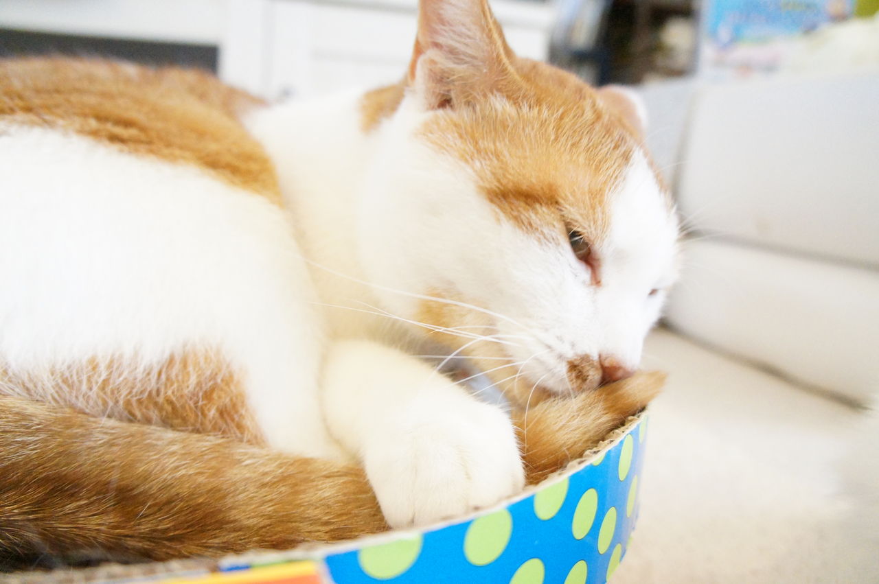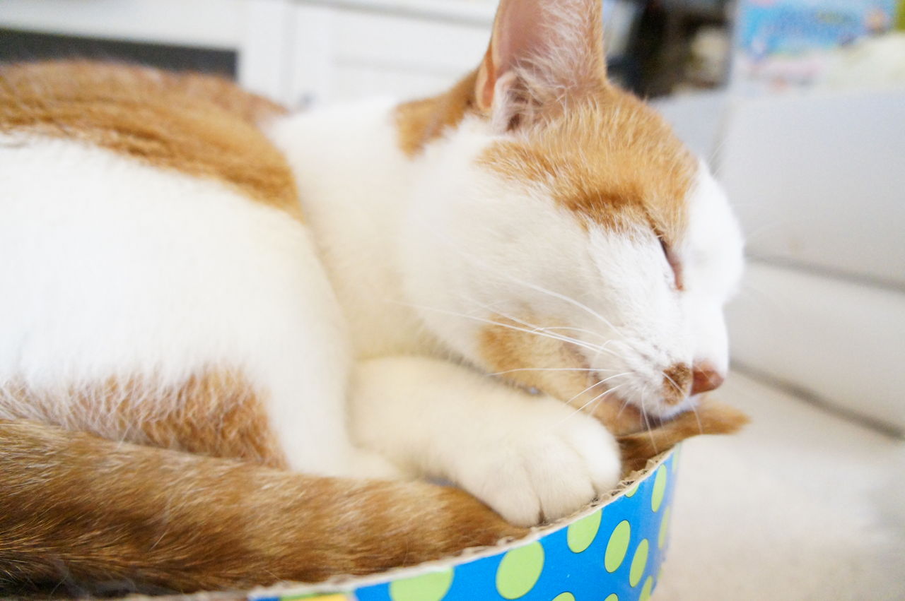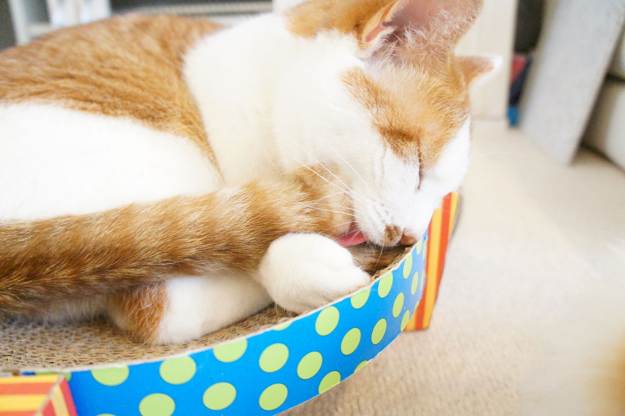 くつろぐのは、もっぱら このお気に入りの段ボール製ベッドの上。