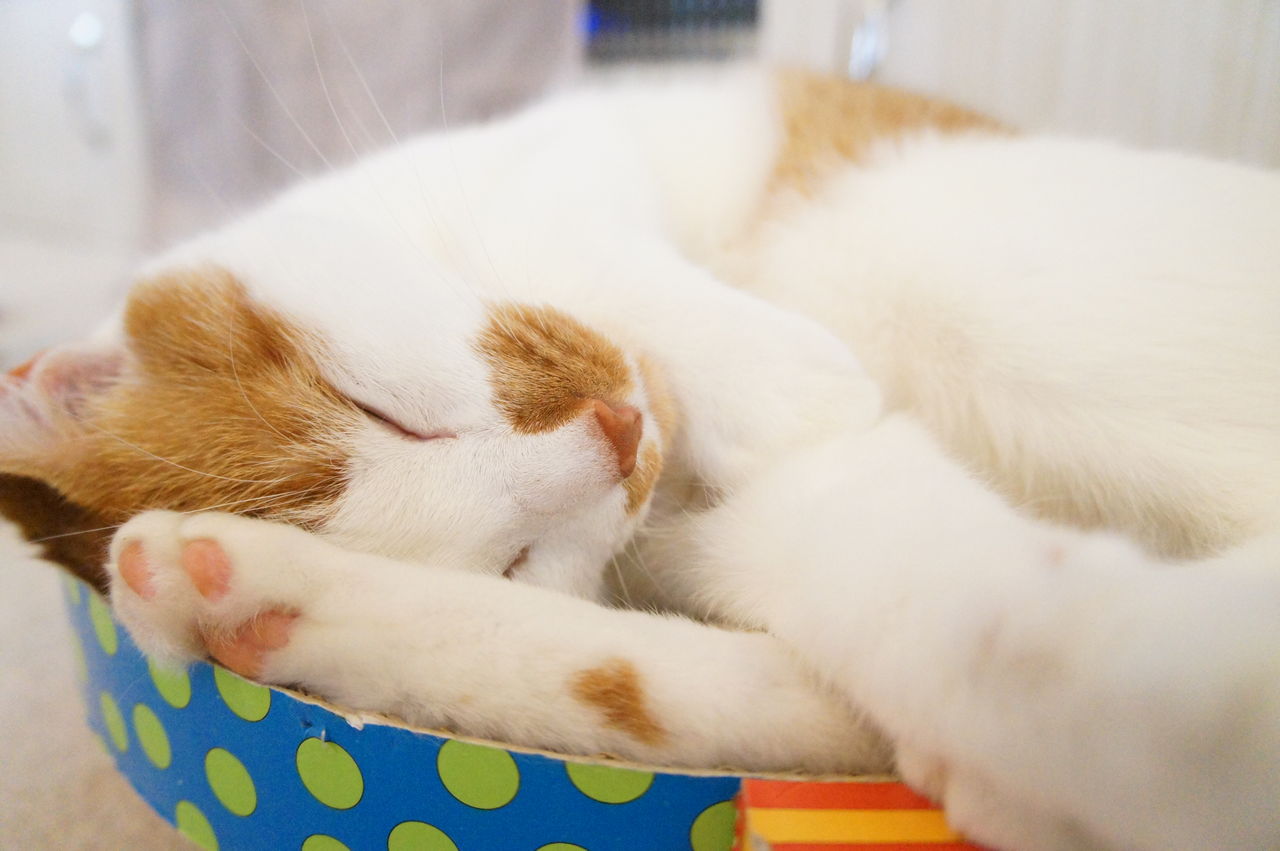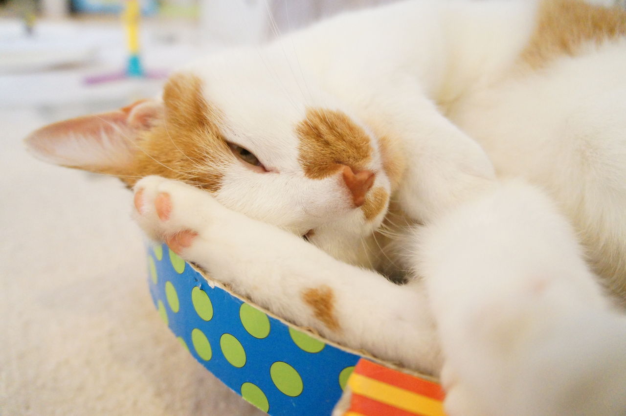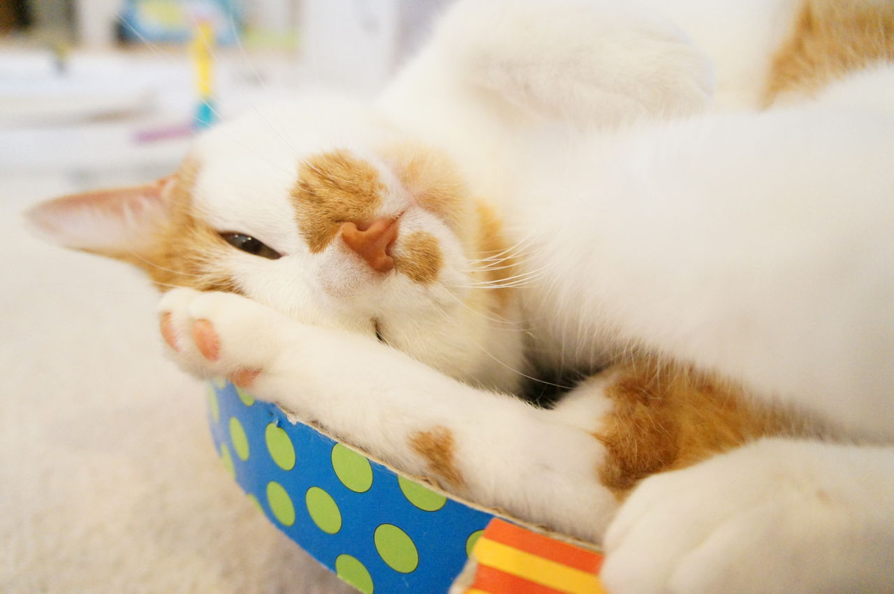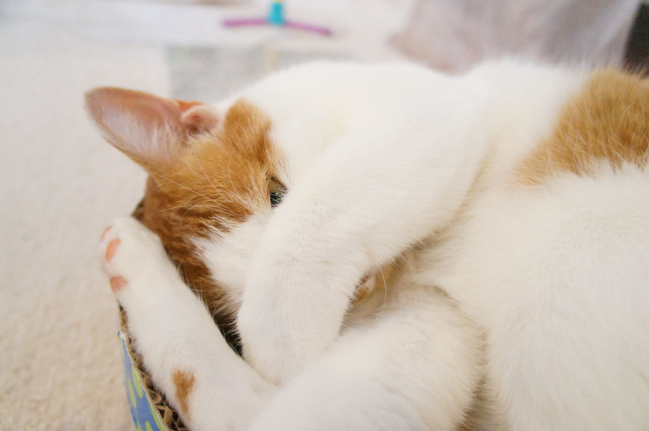 くつろぐのは、もっぱら このお気に入りの段ボール製ベッドの上。