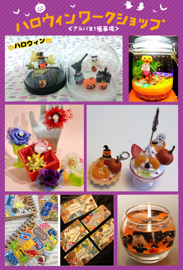 ハロウィンモチーフの「スノードーム」や「ポトリウム」、「デコスイーツ食品サンプル」「ジェルキャンドル」「ジャックオーランタン」「ミニチュア ハロウィンガーデン」などなど、色々なワークショップが盛りだくさん!みなさんもぜひこの機会にチャレンジしてみては?