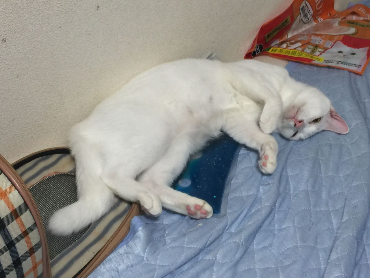 愚痴る麿白。しかし、猫は本来暑さに強いものだぞ。