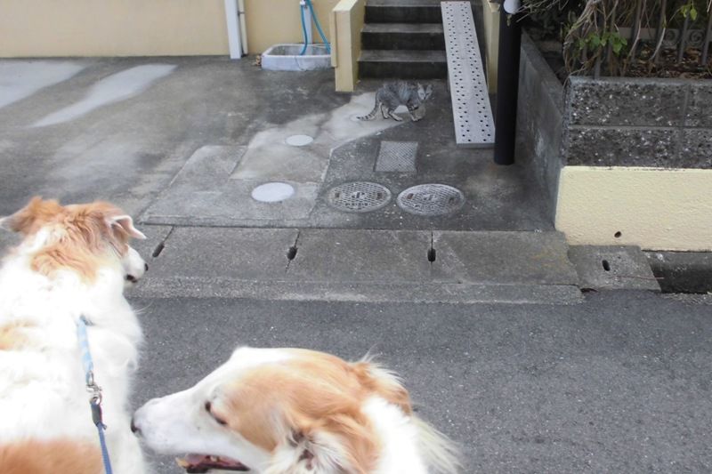 その頃カイ君は階段下で道草中、本当に草食べてます