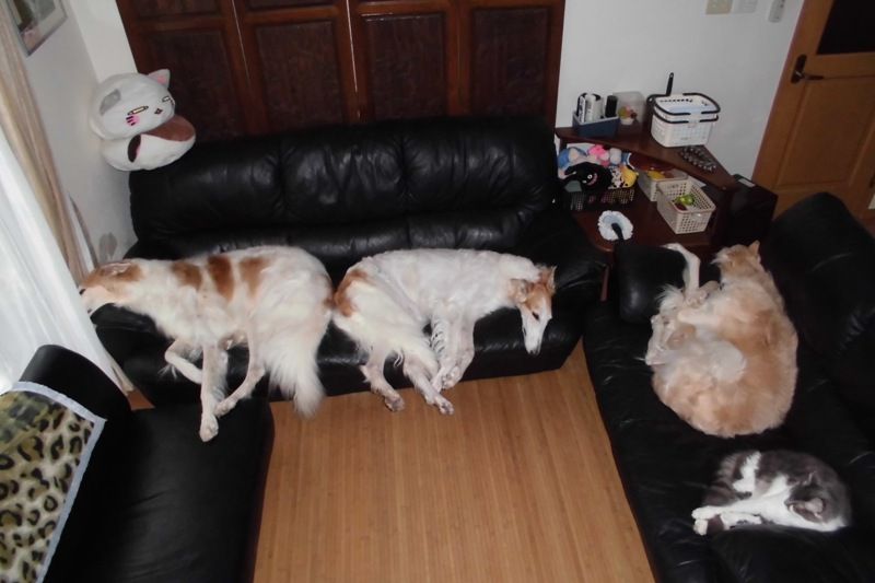 穏やかな午後、銀次も交えてソファーにピッタリ納まる4人