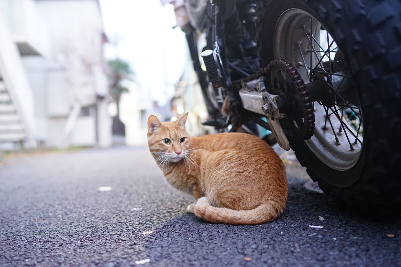 すると日常にあるものと猫みたいな感じになり、よく茶トラ兄弟のいる所にあるバイクを交えて撮る。