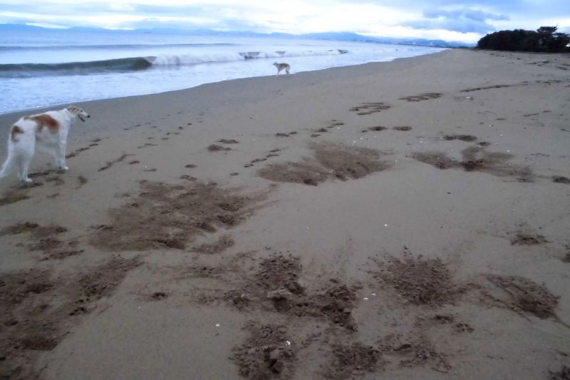 3頭で駆け回った砂浜にはいっぱいの足跡が残ってます