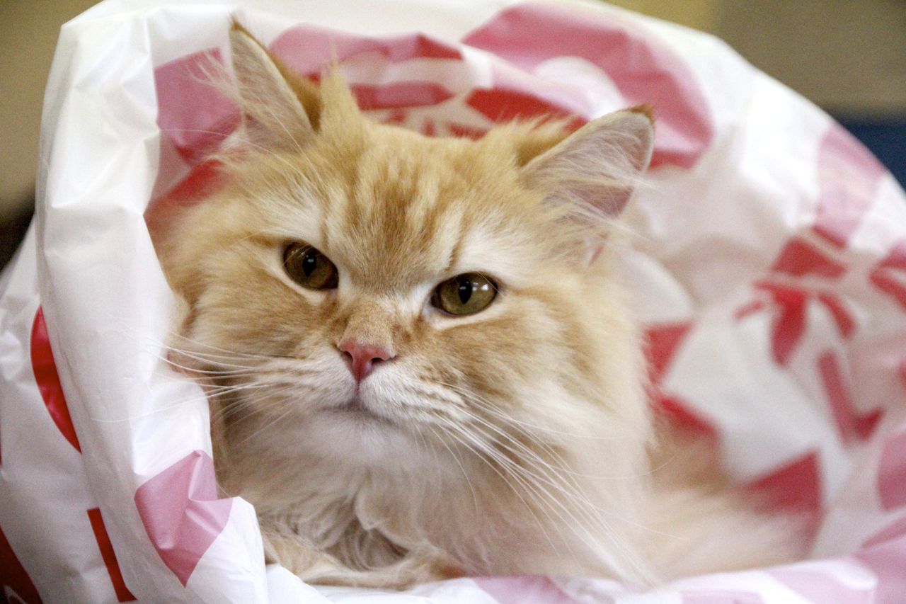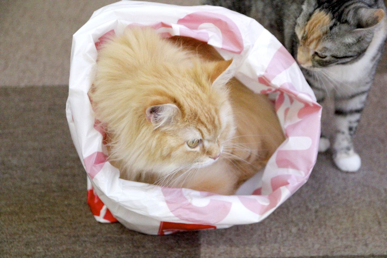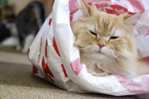 お客様がお持ちした、ゲーセンの袋の中でくつろいでいます。