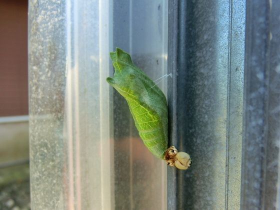 ドッグランの外の支柱に、蝶のサナギを発見。