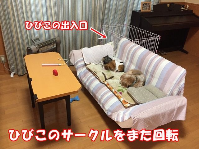 ひびこのテリトリー意識が高いからソファーより後方にサークルを持って行ってたわけですが一週間ほどたったのでソファーとサークルを並べてみる。