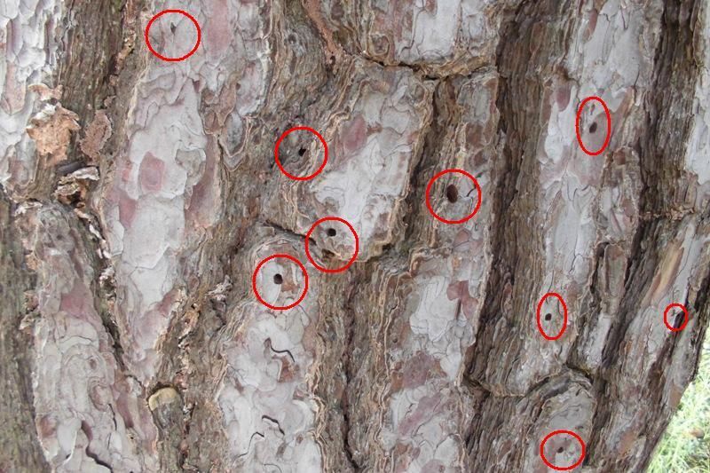 枯れた太い木を見ると、木肌のうろこ状の部分にすべて小さな穴が開いている
