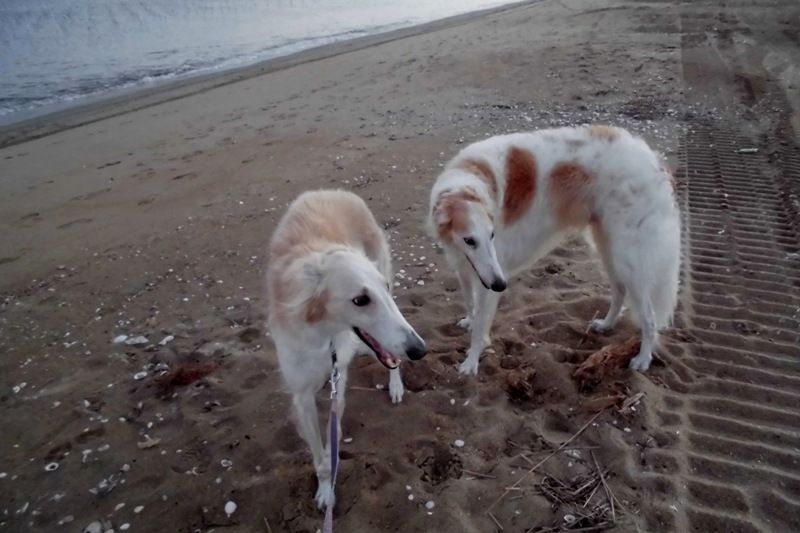 夕方にはボルゾイチーム3頭そろって海岸へ
