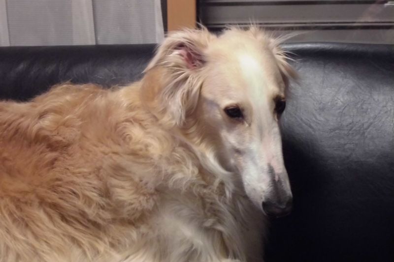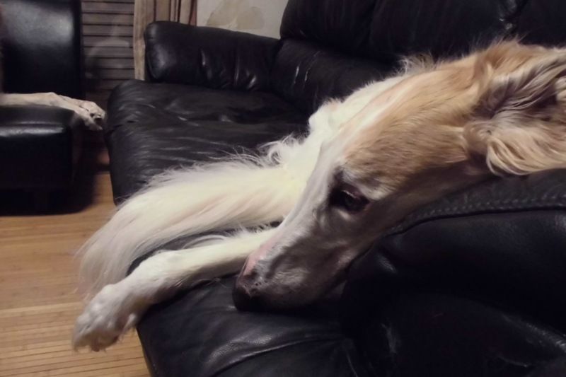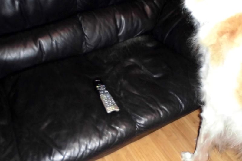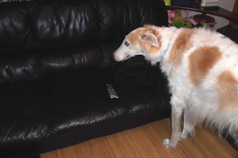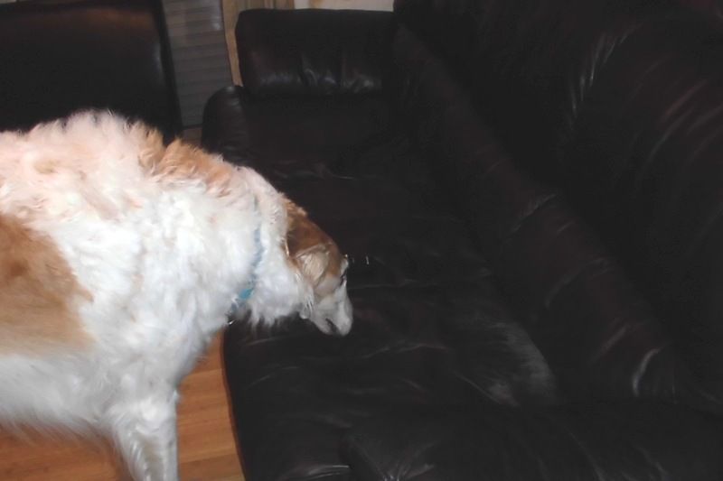 ソファーに座りたいカイ君、何か気になるものがあるのです
