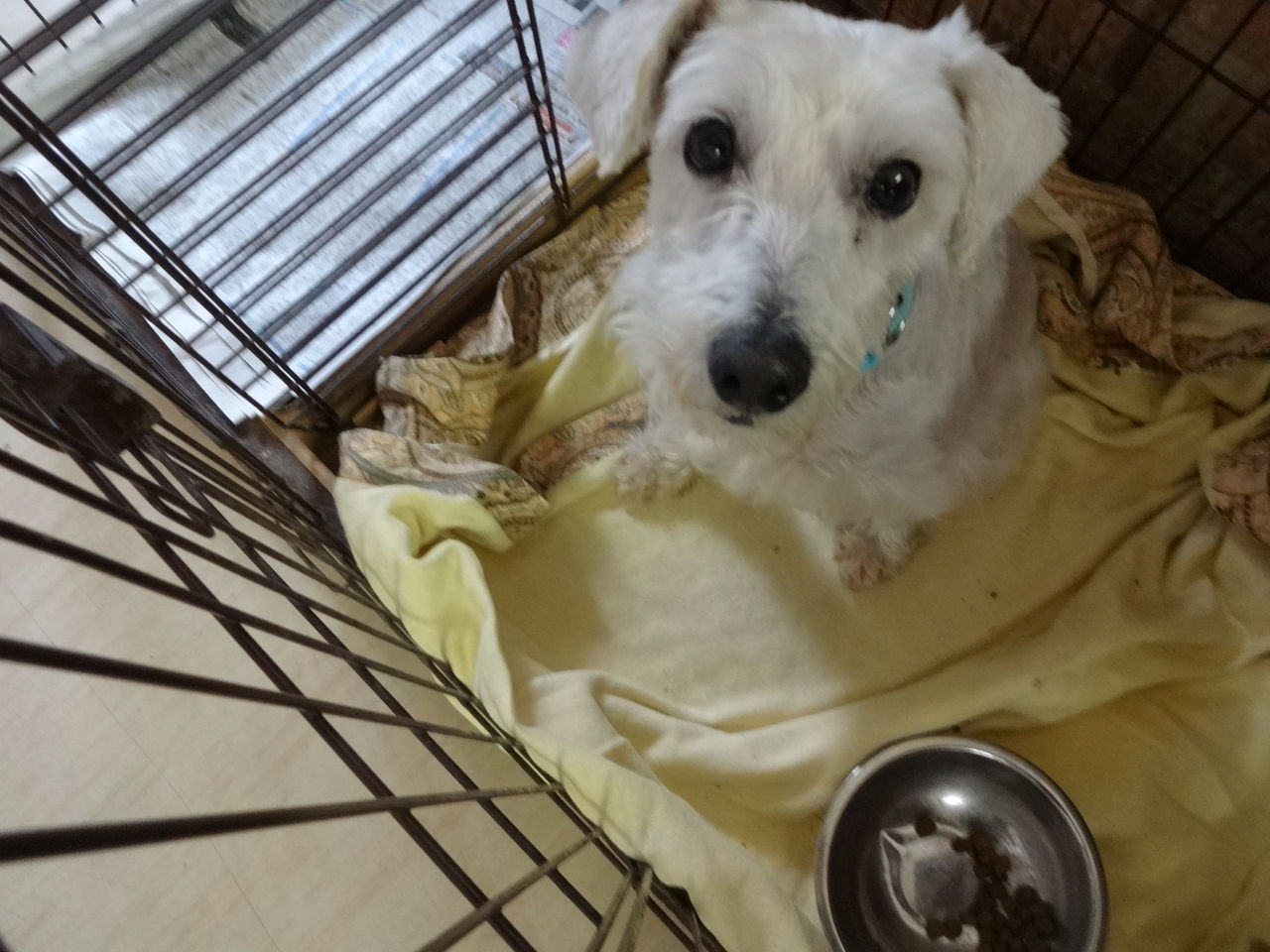 白い子犬ちゃんが、居なくなったゲージで、ちょっと、物足りなさそう、