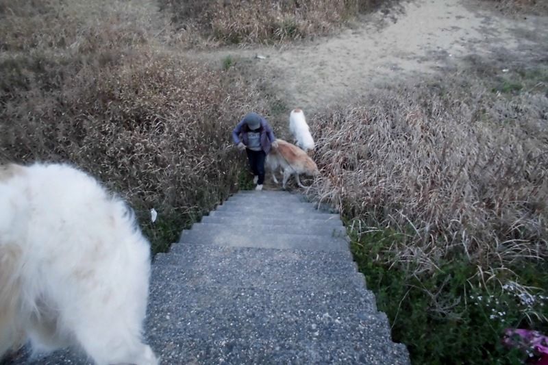 日没前の海岸散歩 単独行動のカイ君は最後に少しだけ見切れています カイ君を探せ(笑) 真っ赤な夕日が沈みます 今日はこの階段から帰ります 陸ぼんも、この急な階段を上手に上りますよ 日が暮れて、自宅に到着 家に入る順番は決まっている(笑) 夕飯まではゆっくり休みましょう にほんブログ村 にほんブログ村