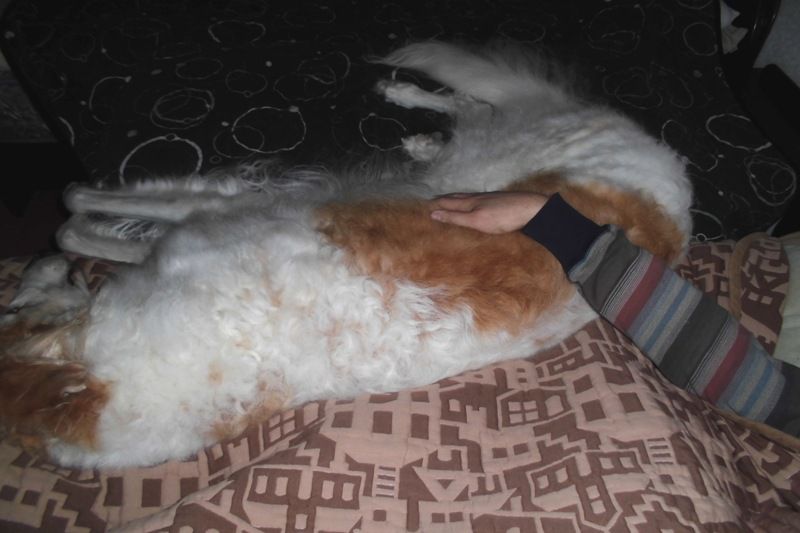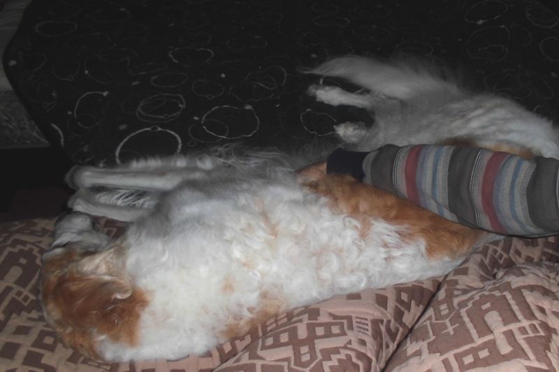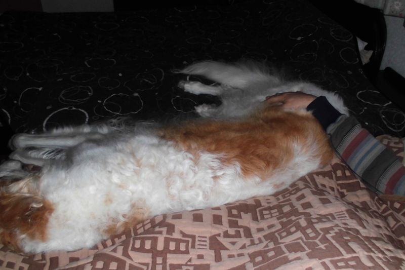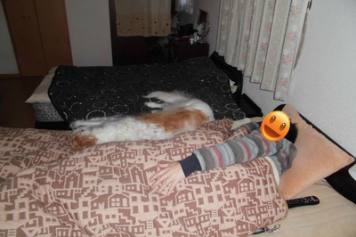 寒いときは父の上に乗り上げているが、暖かくなってきたので父から少し離れて、自分のベッドで寝るようになってきた