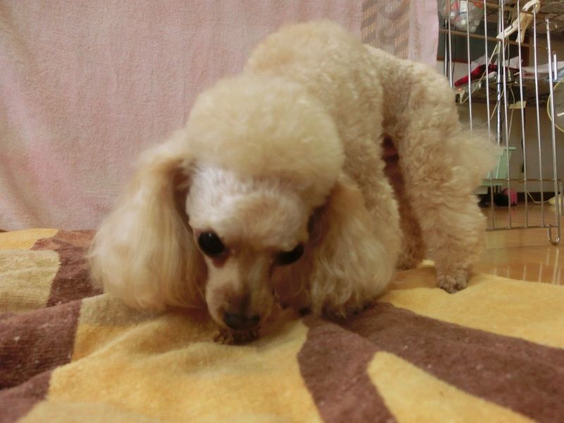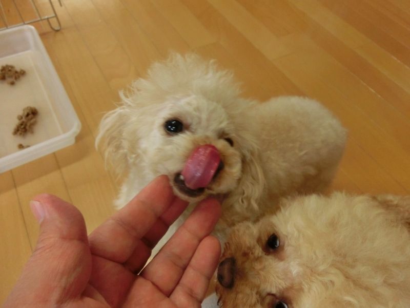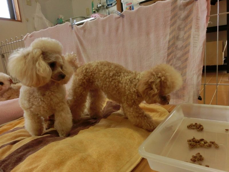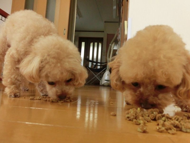 ドッグフードを床にばら撒いてあげると、ガブガブ食べてます。