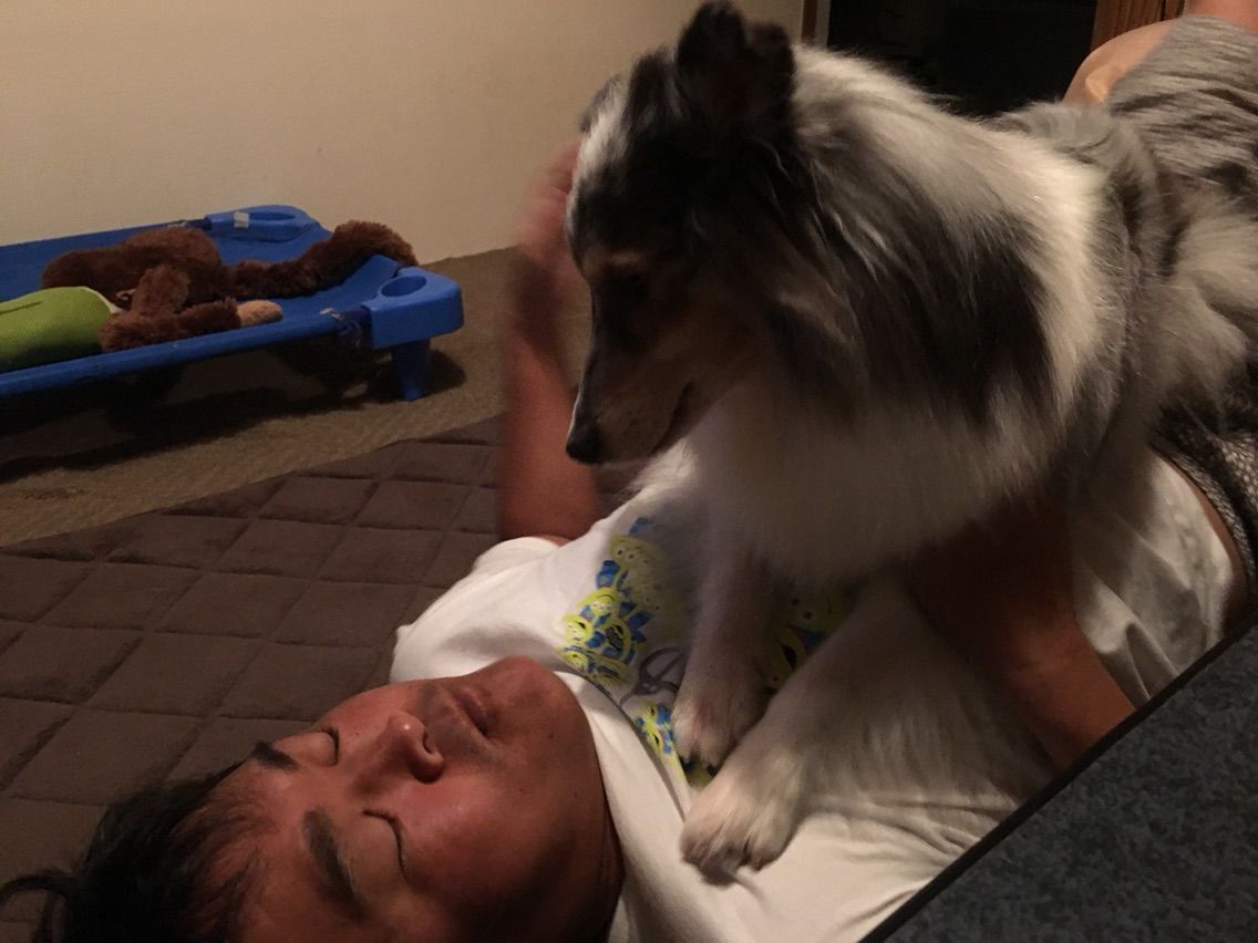 ラブコリーの弥勒、二頭引きであさんぽ中