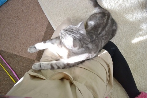 PCで作業してるといつも邪魔してきて、そのまま膝に移動して寝始めちゃう甘えんぼさん。