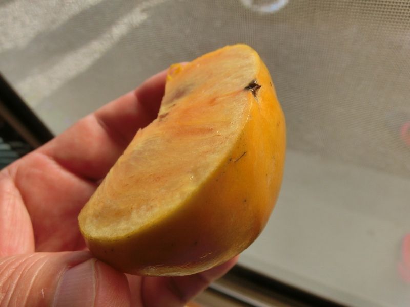 我家の柿が黄色くなってきたので、ひとつ収穫して剥いてみました。