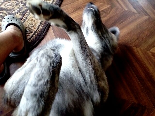 はっちゃん(秋田MIX♂5歳)は、こうやって甘えた後、ガルガル言ってわたしの腕をくわえて遊んでいた。