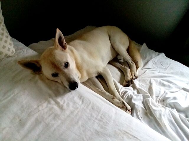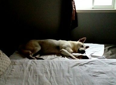 カメラに気づいて薄目を開けたので、「ごめんね」と謝ったら、尻尾をパタッと振って返事をしてくれた。