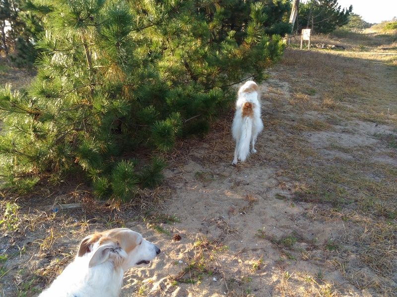 しばらくすると砂浜からカイ君が勢いよく走ってきて、松林の隙間を抜けようとしたとき