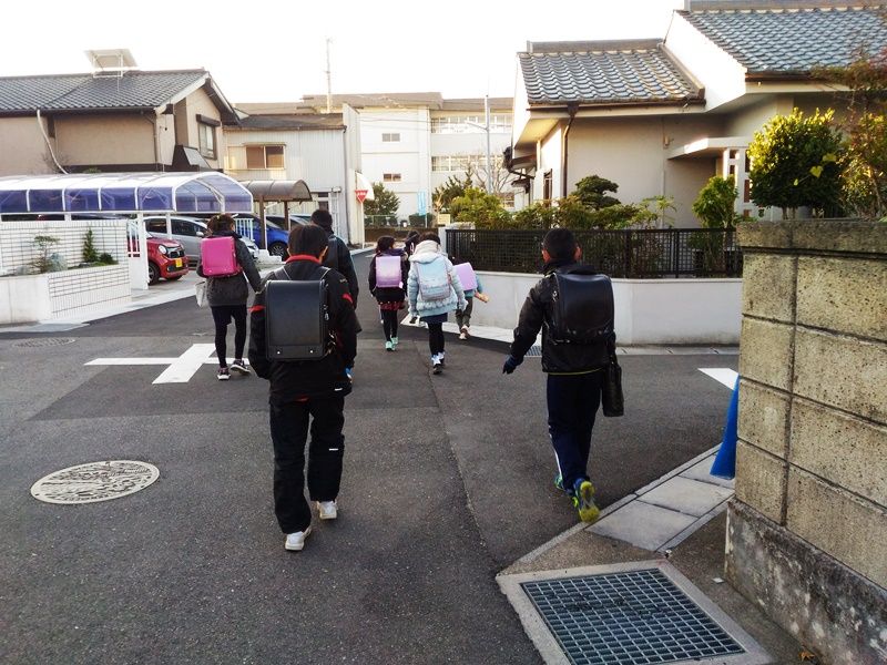 寒さで背中を丸めた(ランドセルを背負ってるからです)小学生の通学時間